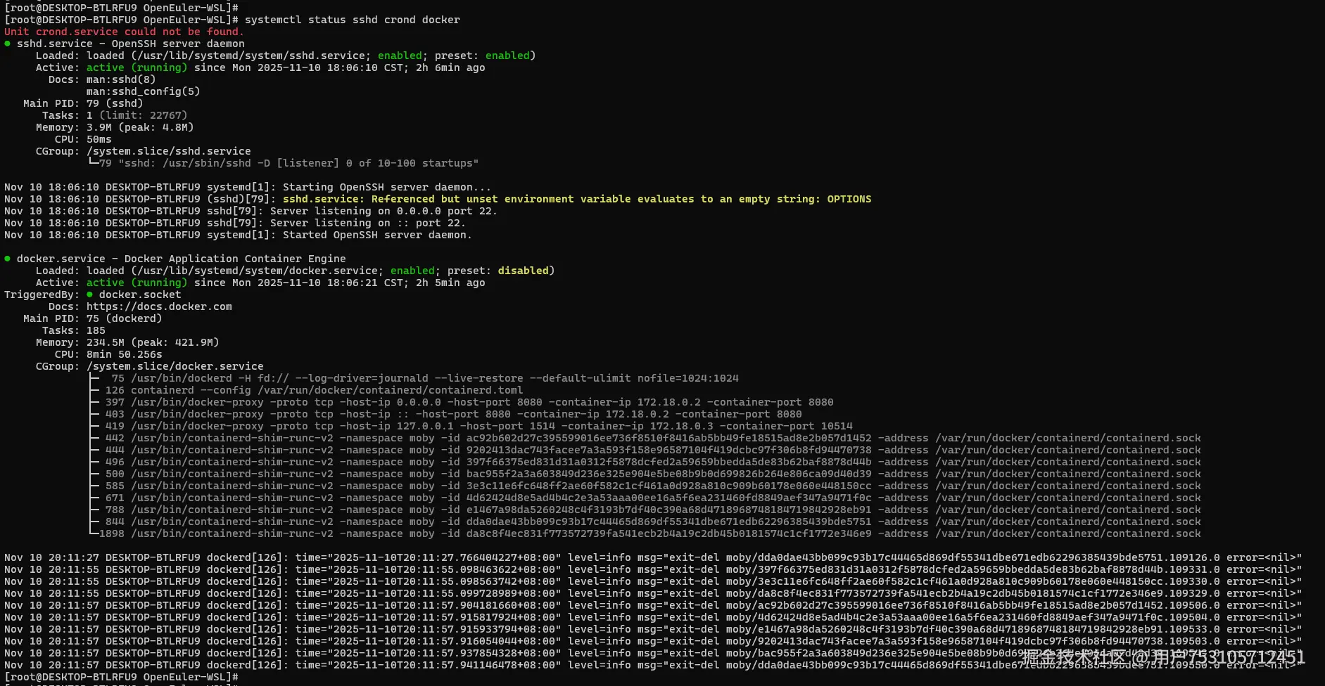 # 输出:SSH服务活跃,Docker服务就绪,crond需安装但框架支持完整