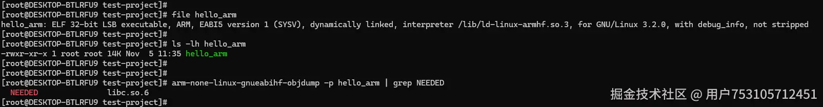 # 输出:-rwxr-xr-x 1 root root 13K Nov 5 11:30 hello_arm