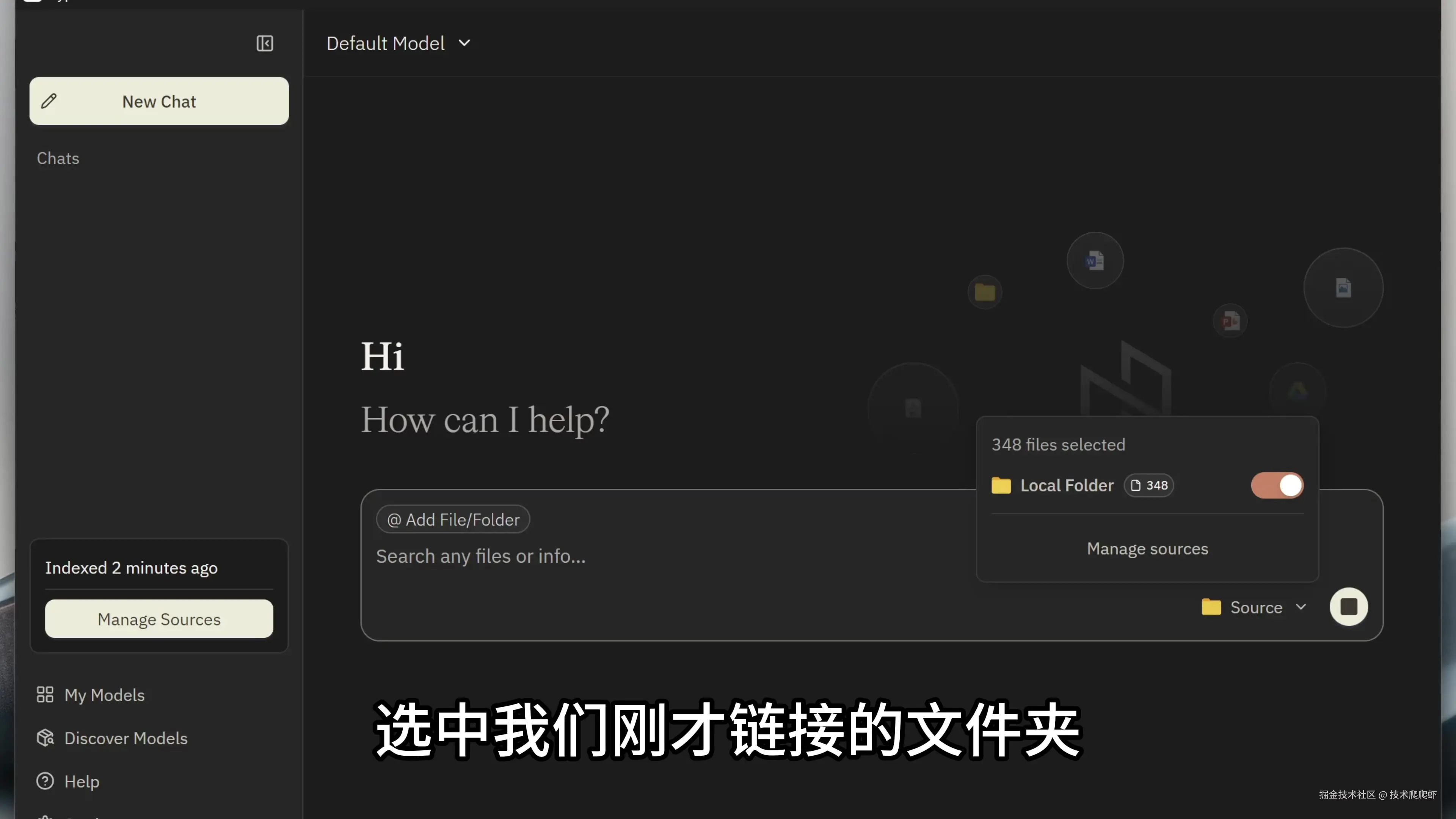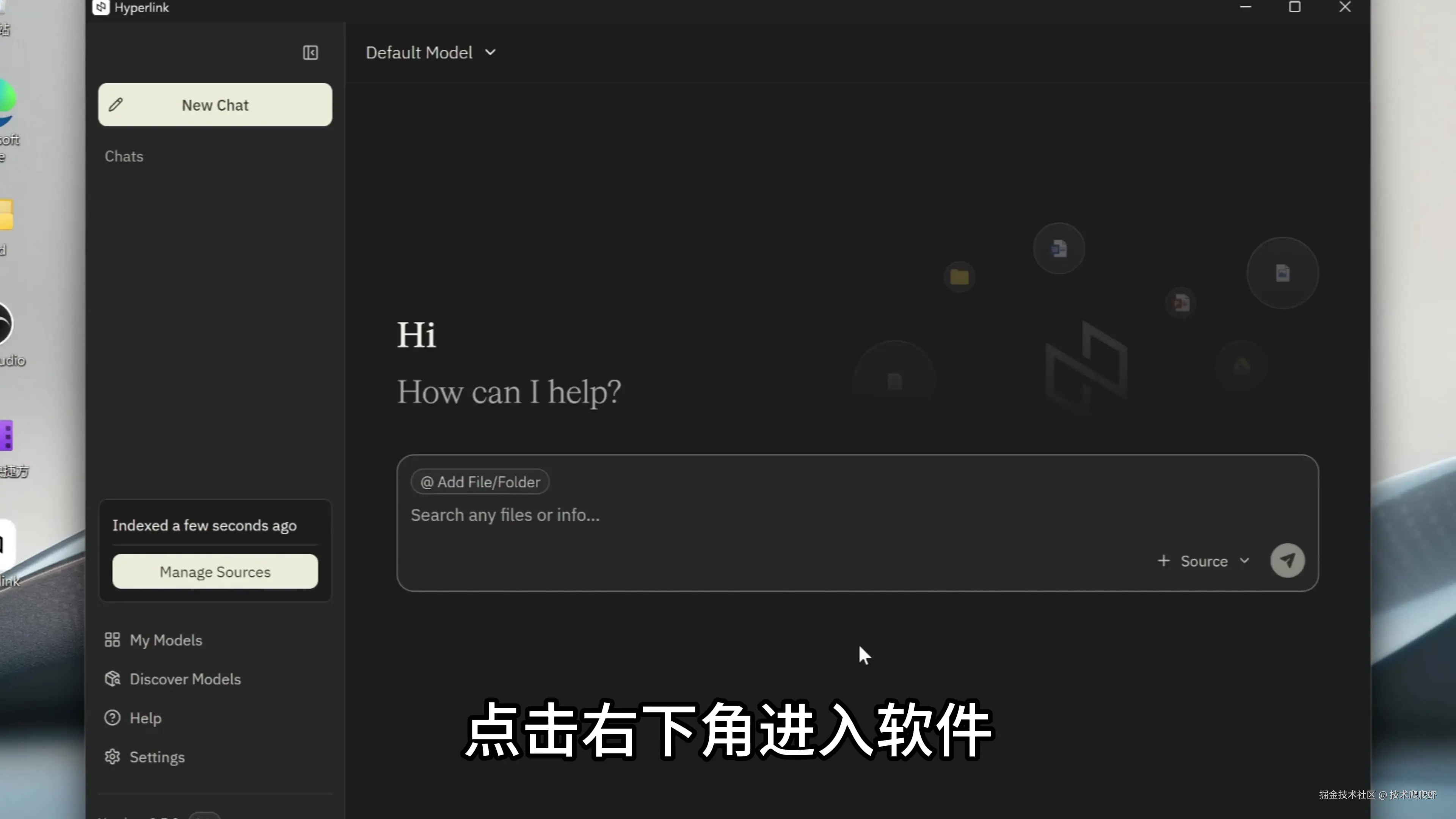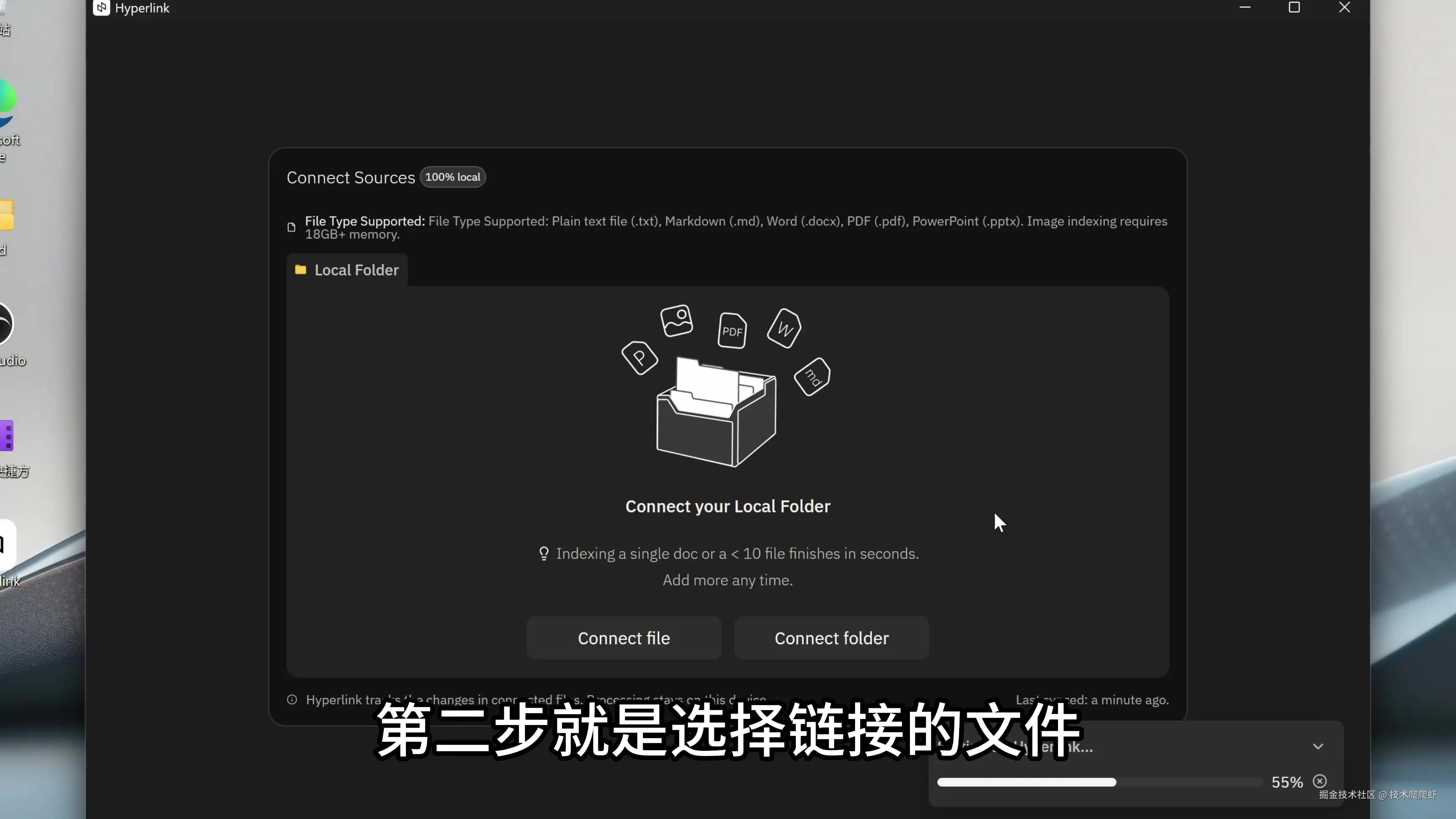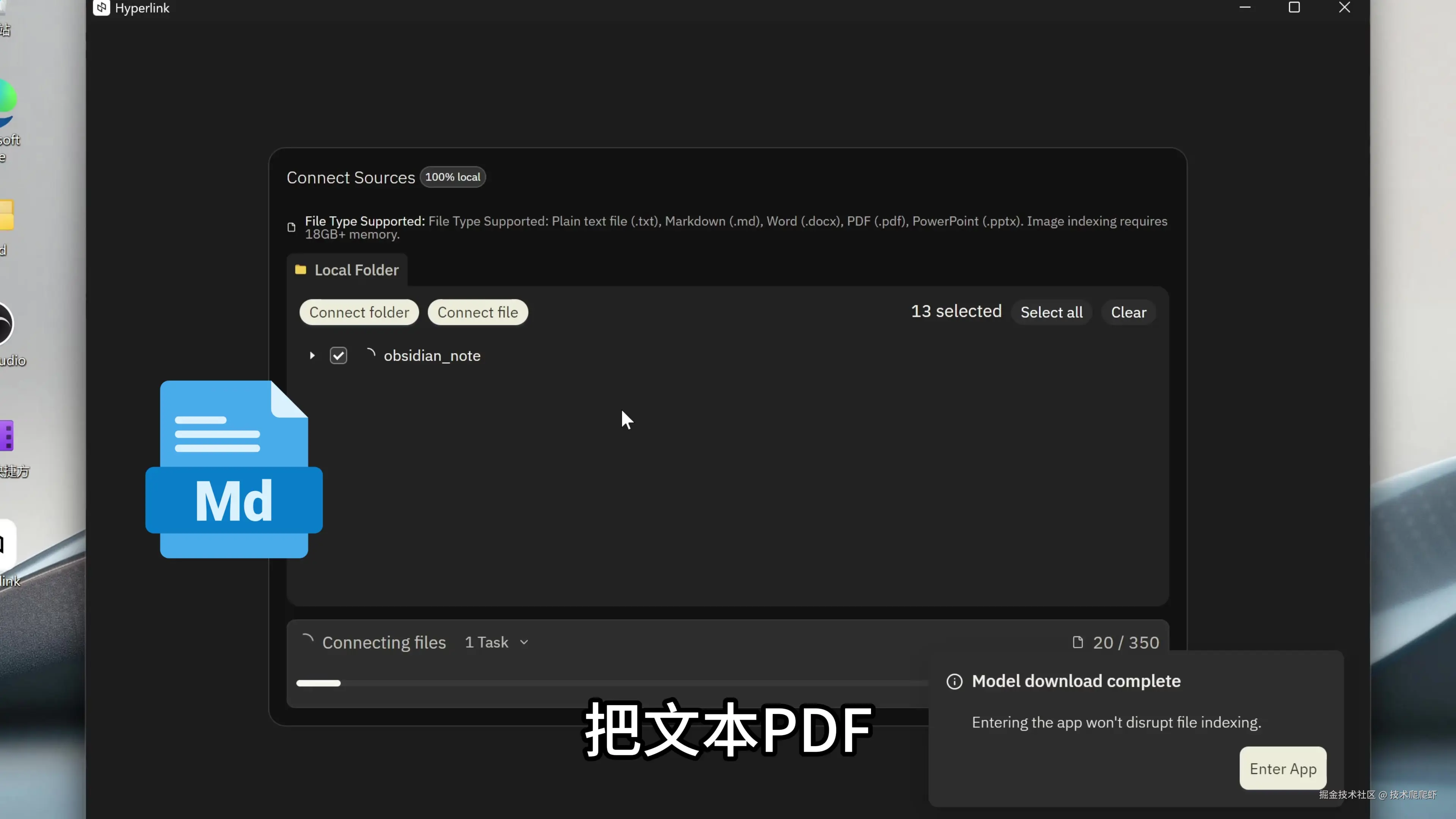 这里我选择obsidian_note文件夹,里面存储了我最近几年记录的所有知识类的笔记,我准备把这些笔记链接进Hyperlink,当做AI知识库使用。Hyperlink会为这些文件创建本地索引,文件夹里面所有新增/修改的文件,都会自动同步索引。文件索引、查找、整理答案,这些都是本地计算的,不会上传到任何云存储,保证了这些文件的私密性。Hyperlink管理的文件数量没有最大限制,一次可以索引几千个文件。索引完成,点击右下角进入软件。