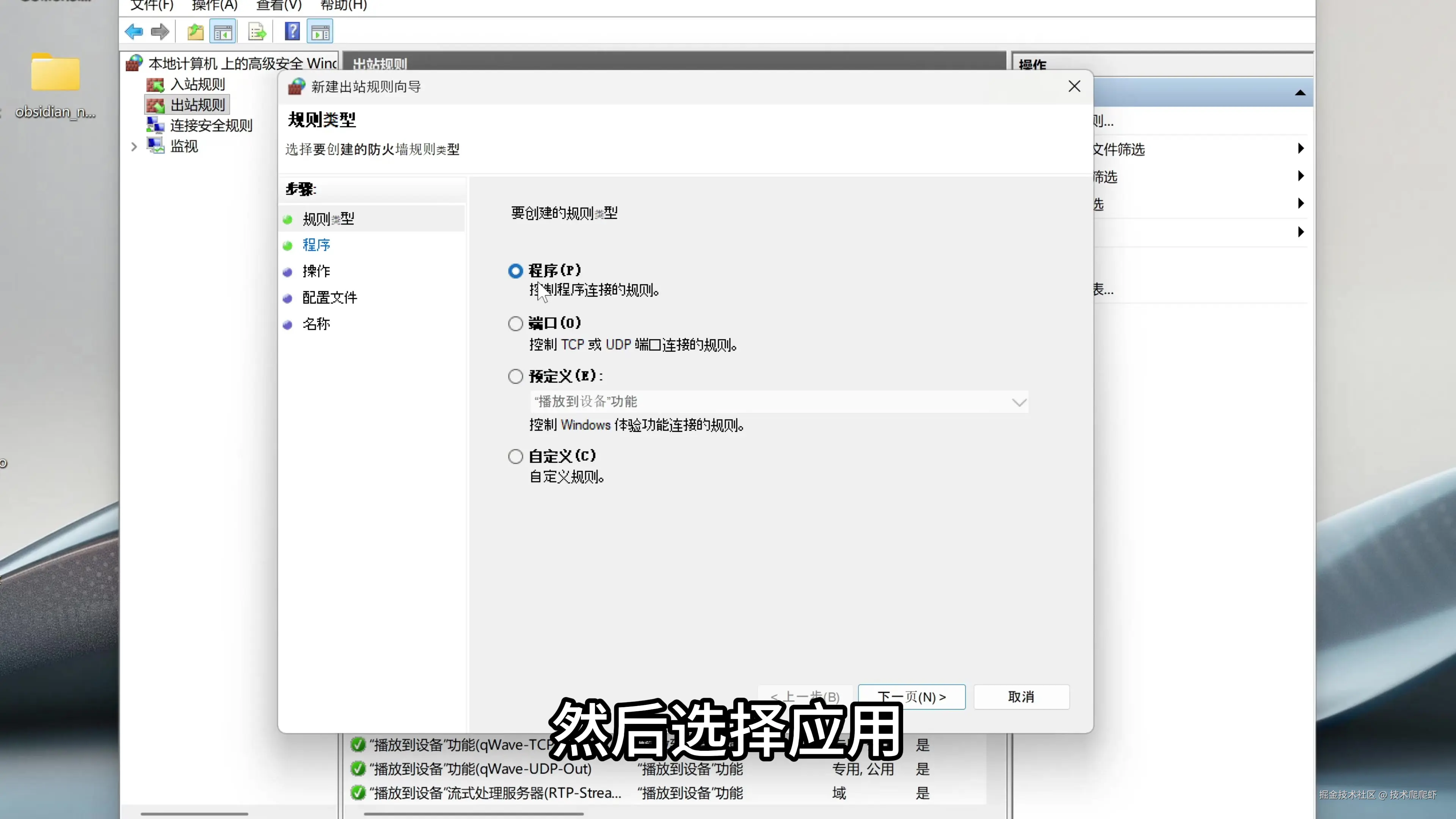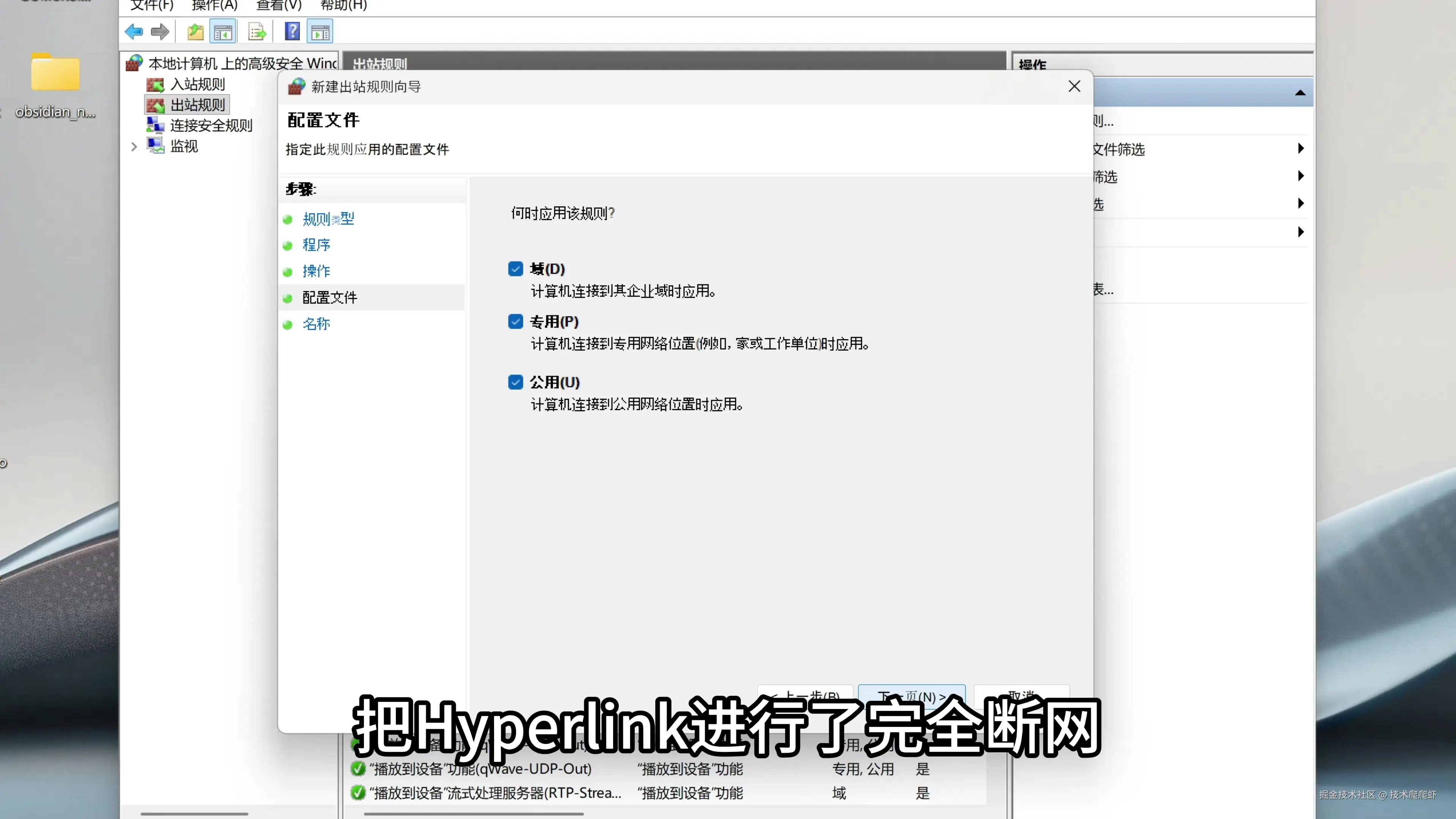 我们来做一个实验,看看Hyperlink是否真的百分百离线运行。我们在搜索栏搜索Windows防火墙,在出站规则这里选择新建出站规则,然后选择应用。