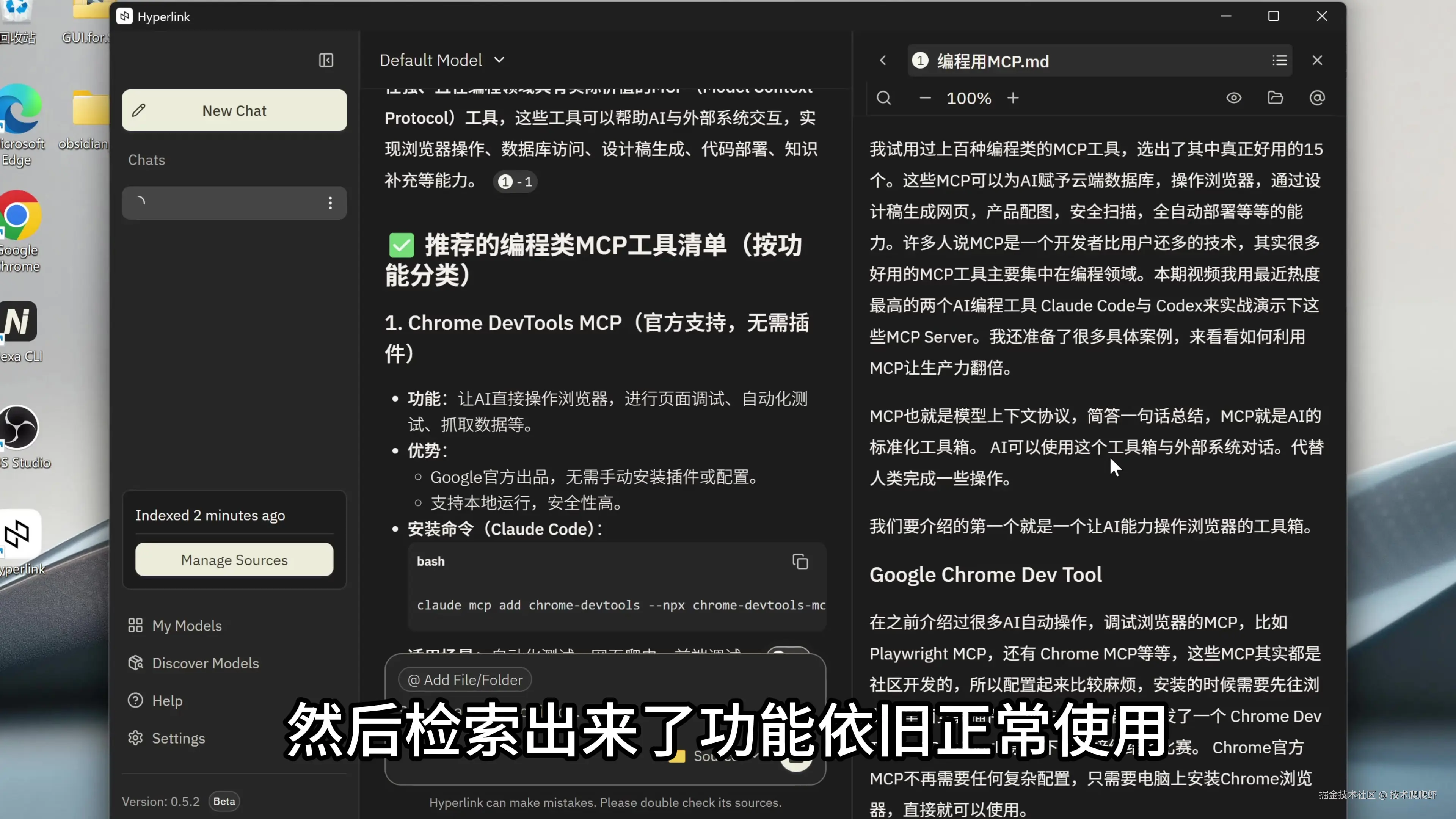 回到软件我们来测试一下,这里我进行一下文件索引,然后我问AI:“编程类的好用的MCP有哪些?” 这里AI在文件里面查找到了上期视频的文案,然后检索出来了,功能依旧正常使用。