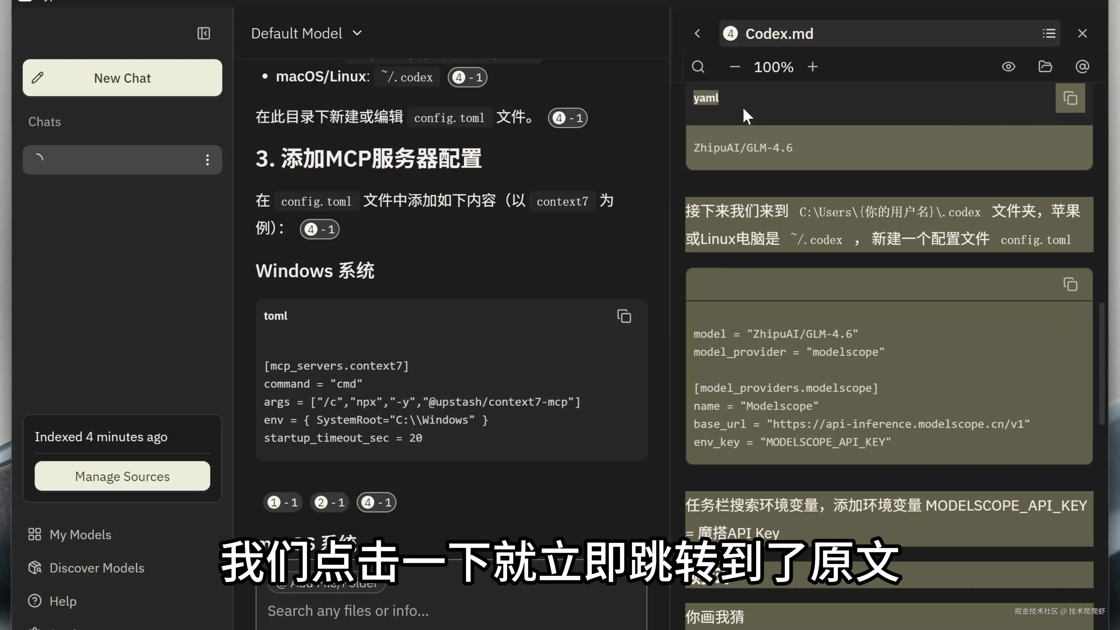 我的第一个问题是:“Codex怎么配置MCP?” 这里看到,Hyperlink成功检索到了我之前记录的笔记文案,并且输出了答案。在答案下面还有一个引用链接,我们点击一下就立即跳转到了原文。