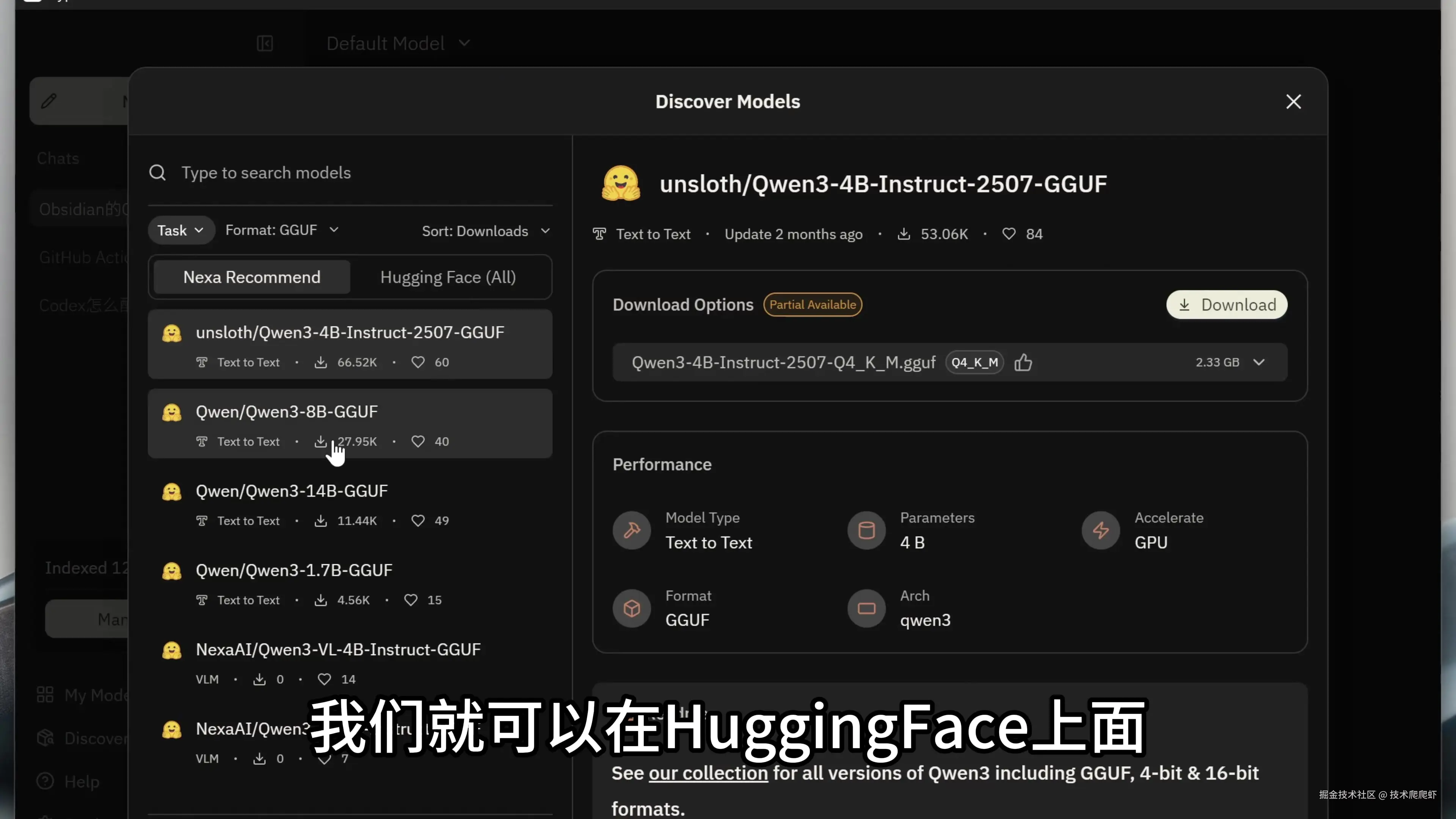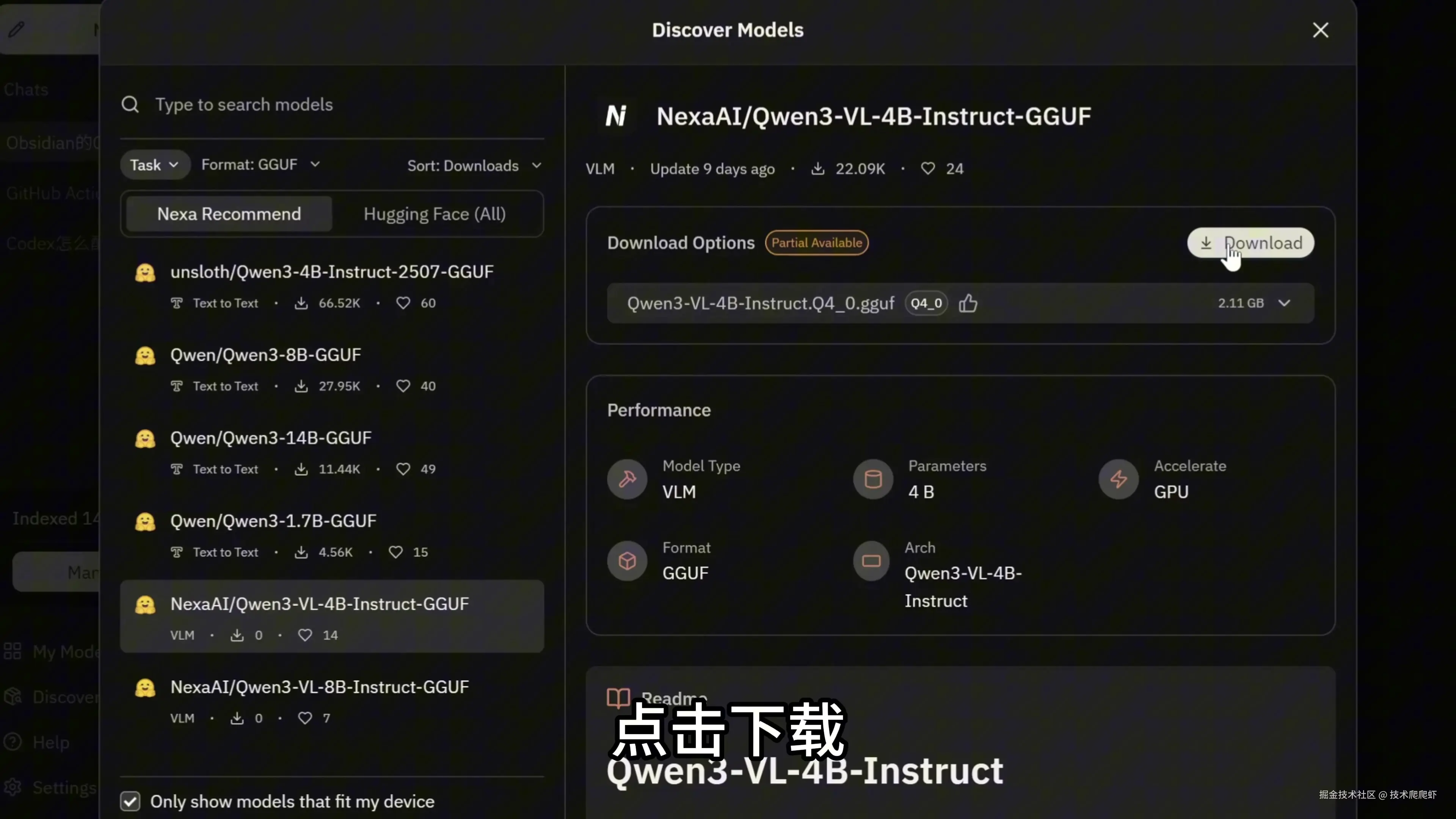 Hyperlink里内置了NexaML推理框架,这是一个比Ollama更强大的本地推理引擎,可以将端侧小模型高效部署在CPU、GPU、NPU等各类算力芯片上。NexaML针对NPU硬件进行了独特设计,能够尽可能地利用到市面上的NPU算力。在PC端、手机端、汽车座舱端、IoT端都可以使用该推理引擎。NexaML拥有在任何后端上支持任意模型的能力。比如说最近,Qwen团队推出了最强端侧多模态模型 Qwen3-VL-4B和8B,模型发布当天,Nexa团队就进行了首发的技术支持。目前还没有其他的本地AI推理框架支持Qwen3 VL 4B/8B,这个最强端侧多模态模型,NexaML是唯一的一个。通过NexaML,Qwen3模型目前可以通过一行代码就在PC上运行起来。如果您是开发者,可以使用Github上的开源项目 NexaSDK 来轻松使用NexaML框架,制作自己的本地AI APP。Hyperlink就是使用NexaSDK做的,并且NexaSDK是市面上最简单易用的端侧AI开发SDK。我们说回到Hyperlink,这里我选择Qwen3-VL-4B模型,点击下载。