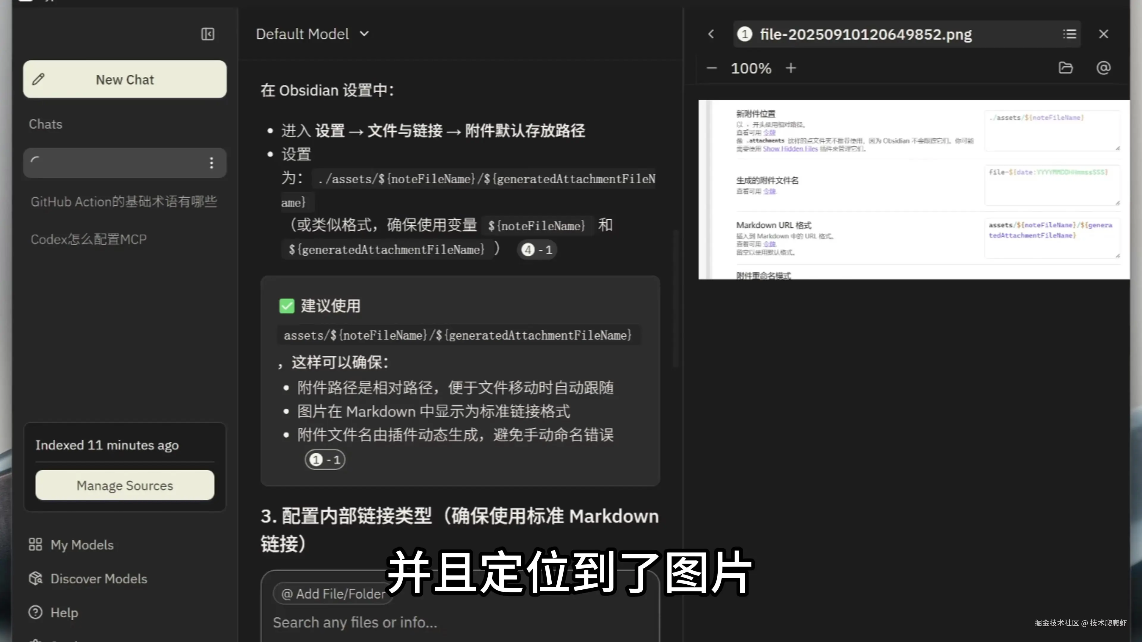 Hyperlink也支持图片搜索,我的下一个问题是:“Obsidian的Custom Attach Location插件如何配置Markdown URL?” 这个信息是存在一个图片里面的,Hyperlink也成功进行了检索,并且定位到了图片。