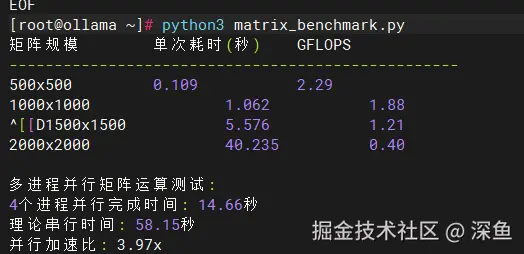 测试结果表明,在openEuler系统上进行矩阵运算时,小规模矩阵(500x500)能够达到2.29 GFLOPS的性能,这对于虚拟机环境来说是非常优秀的表现。随着矩阵规模增大,单核性能会受到内存带宽的限制,但多进程并行场景下,4个进程同时运行的加速比达到3.97倍,几乎达到了理论最优值。这充分证明了openEuler在多核资源调度上的优势,能够有效地将计算任务分配到不同的CPU核心,同时优化内存访问模式,避免缓存冲突和内存带宽瓶颈。