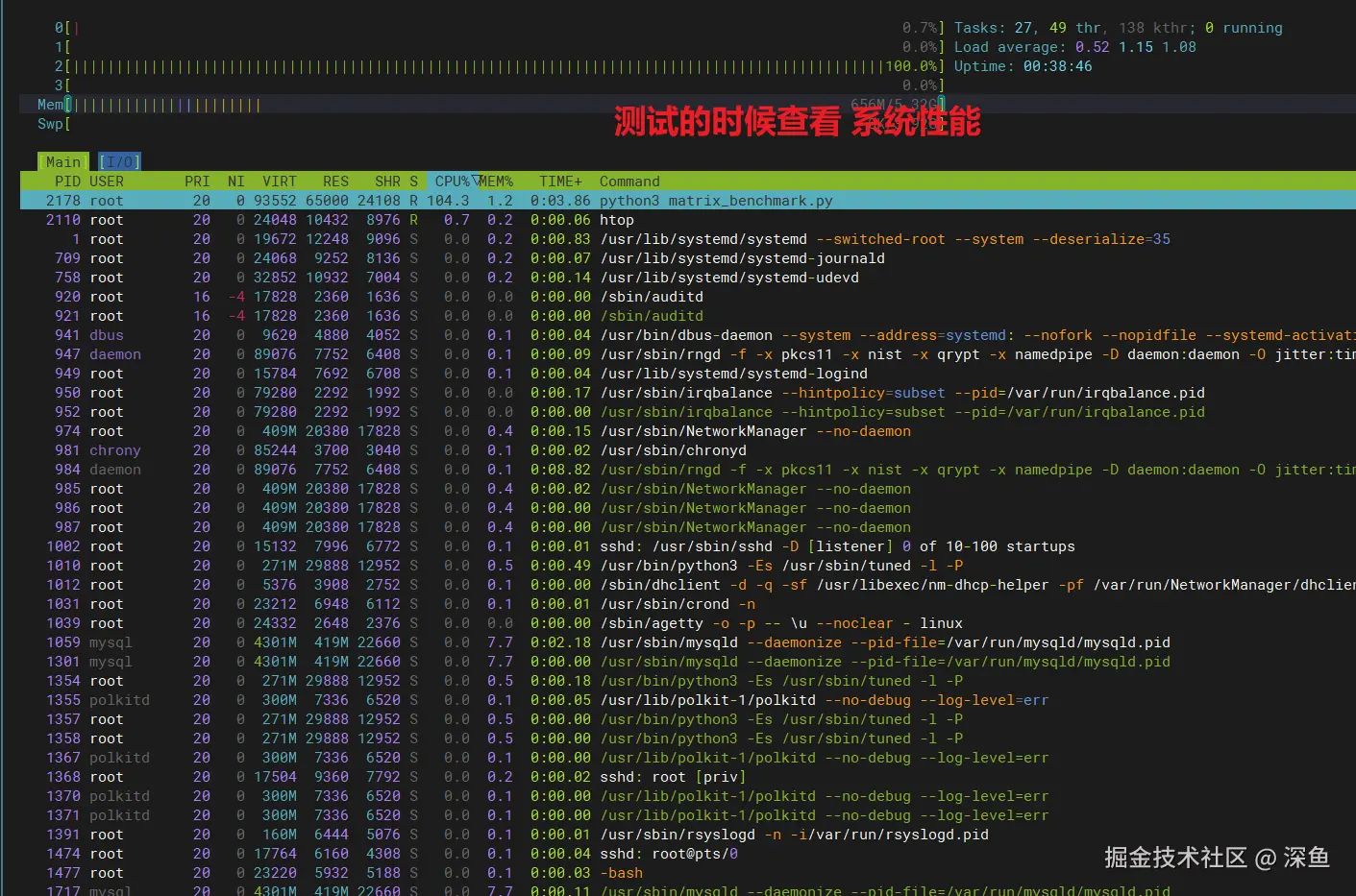 通过uptime命令可以看到,在测试期间系统负载达到了0.67-1.11之间,说明CPU资源得到了充分利用。通过htop可以直观看到,在执行多进程任务时,openEuler能够将4个进程均匀分配到4个CPU核心上,每个核心的利用率都接近100%,没有出现某个核心空闲而其他核心过载的情况。这种均衡的负载分配正是openEuler调度器优化的成果。