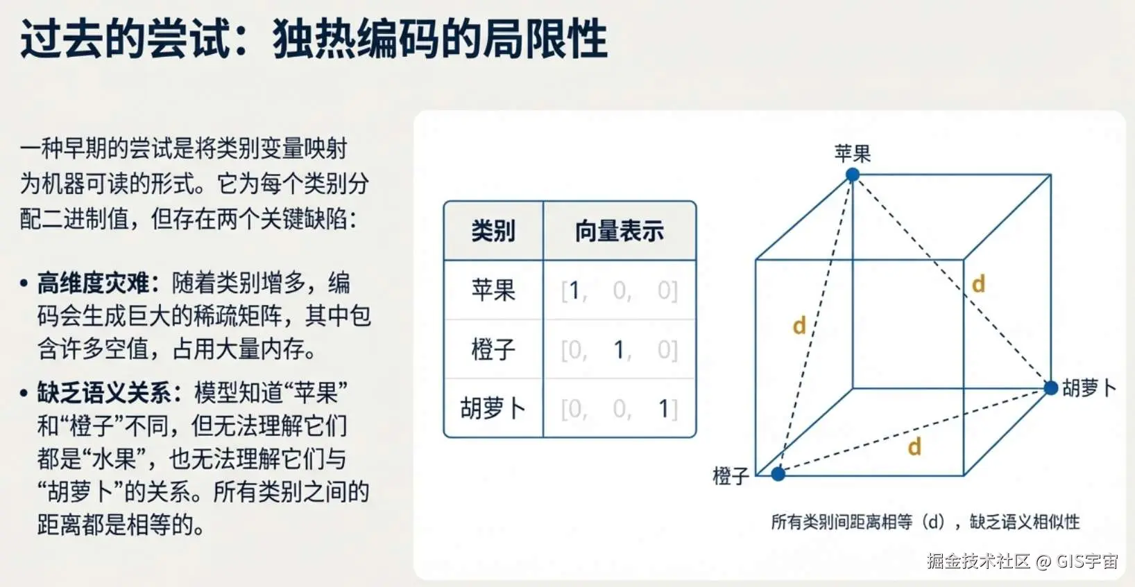 嵌入技术则完美地解决了这个问题。在独热编码的数学世界里,“苹果”和“橙子”的距离与“苹果”和“胡萝卜”的距离毫无区别。