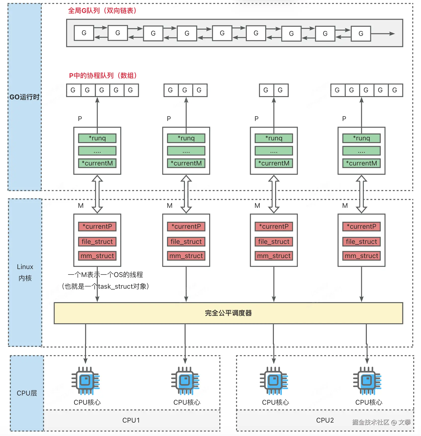 - M:执行载体,动态绑定P避免资源闲置;