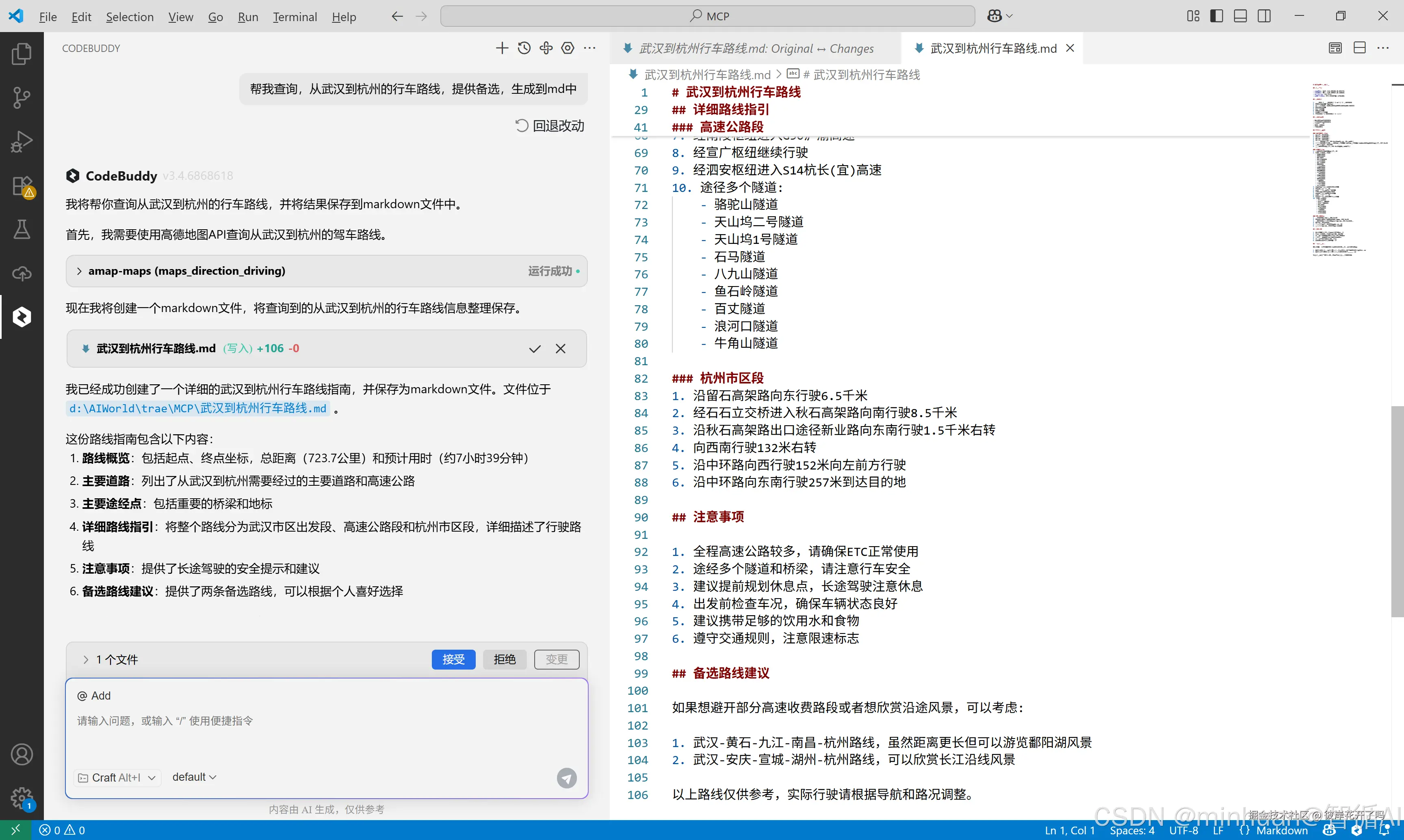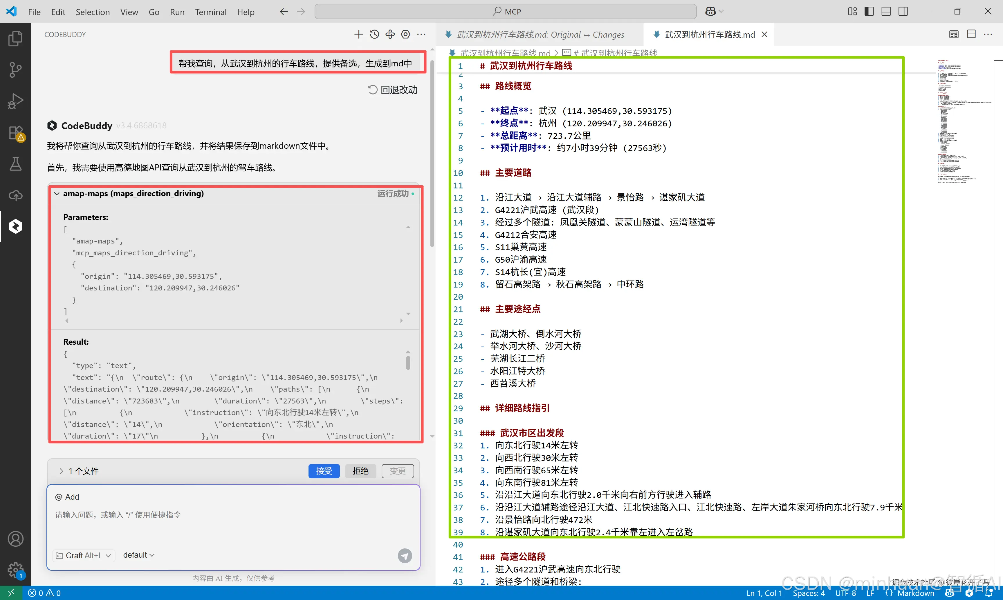 我们尝试发送一个指令:“帮我查询,从武汉到杭州的行车路线,提供备选,生成到md中”;指令发送后,首先调用了高德MCP的驾车路径规划 API (maps_direction_driving),可以根据用户起终点经纬度坐标规划以小客车、轿车通勤出行的方案,并且返回通勤方案的数据。