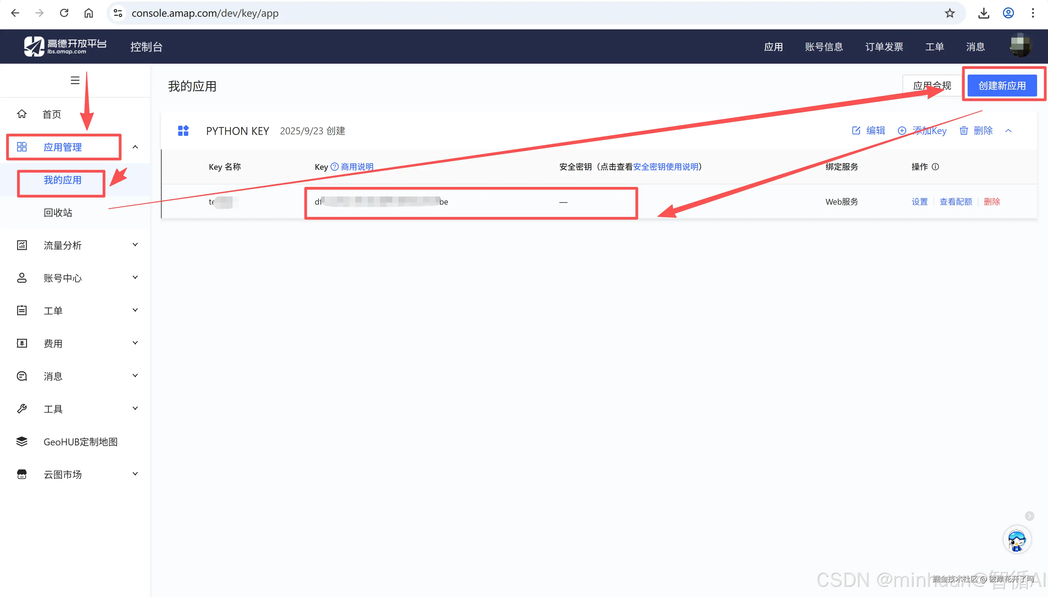 1.2 打开【应用管理】-> 【我的应用】-> 【创建新应用】,输入【应用名称】和【应用类型】-> 然后点击【新建】,即产生了我们要用的Key