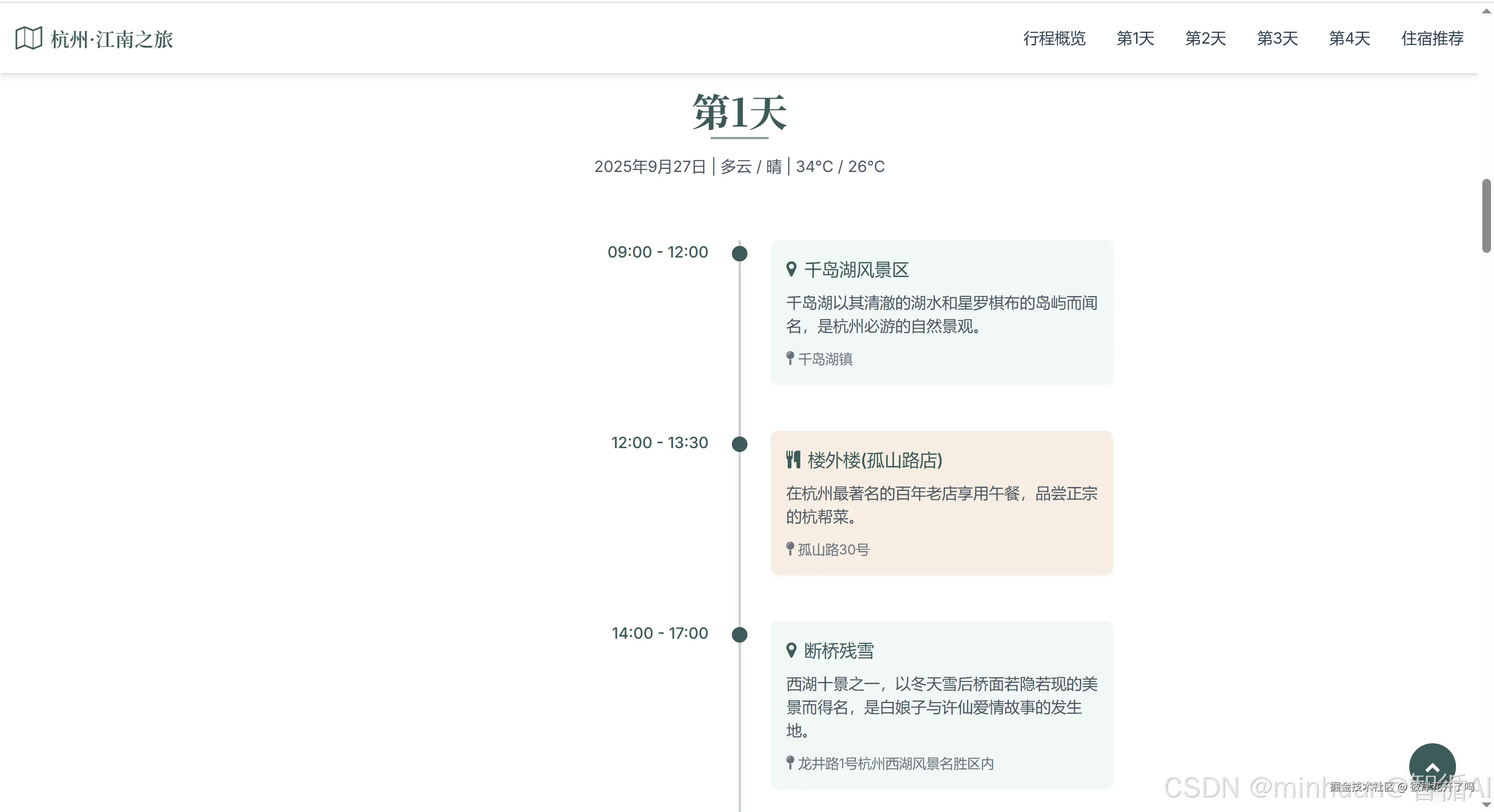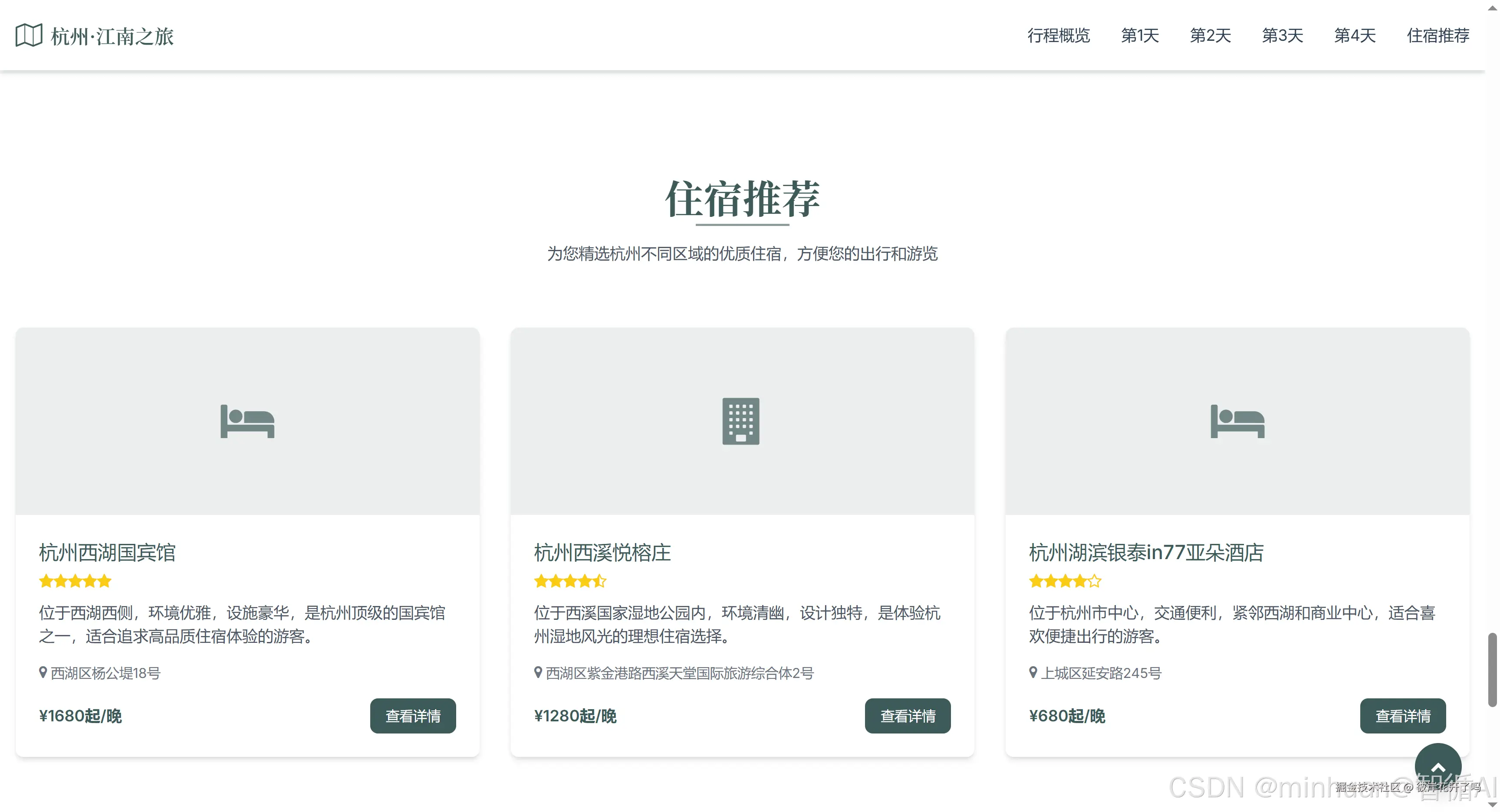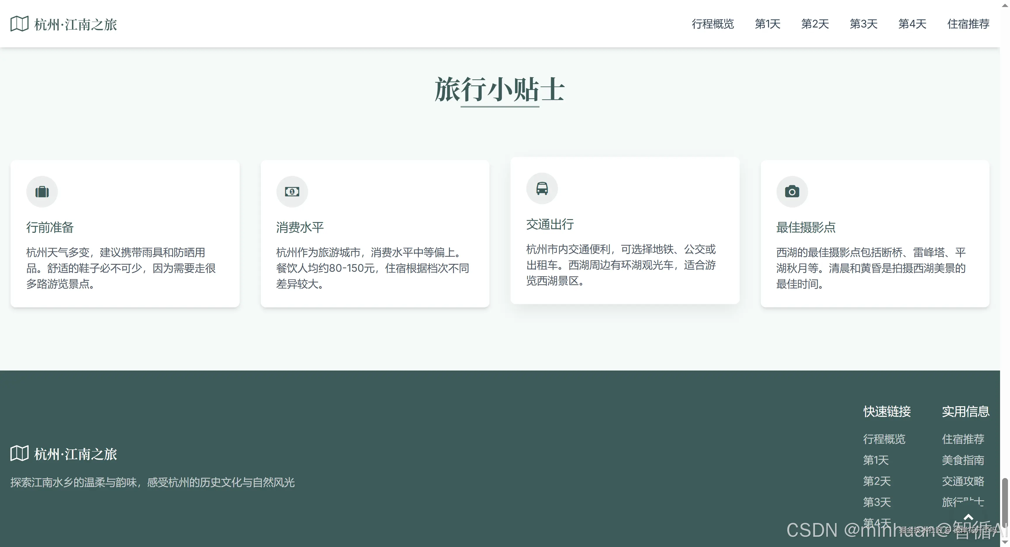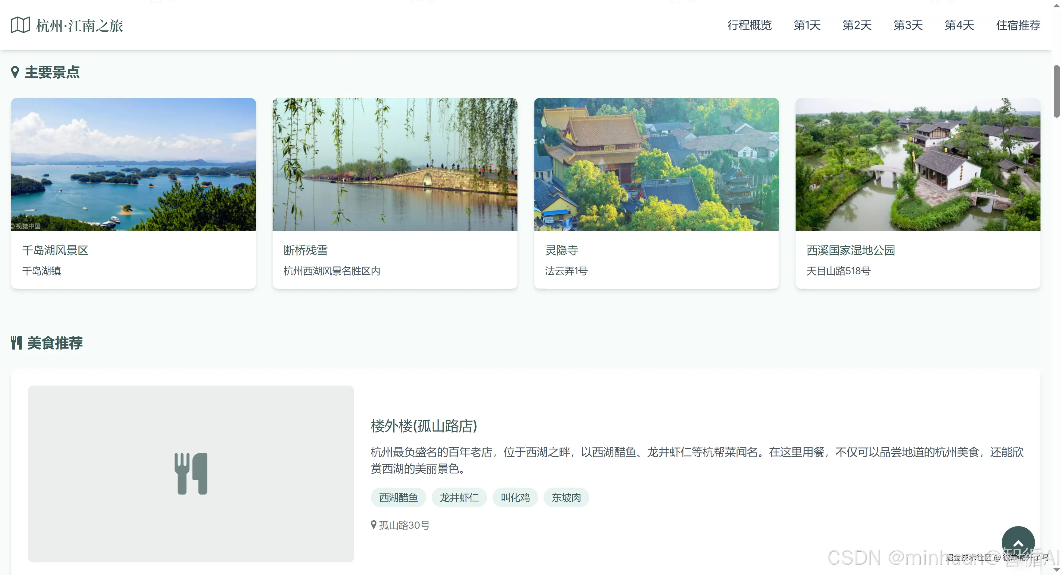 根据我的提示指令生成一个旅游攻略的页面,提示词“帮我规划一个杭州4日游的攻略的html,推荐美食、景点、住宿、以及各景点中间的接驳方案,界面风格采用江南水乡的风格、同时要有青春、旅行的元素,支持移动端观看”;