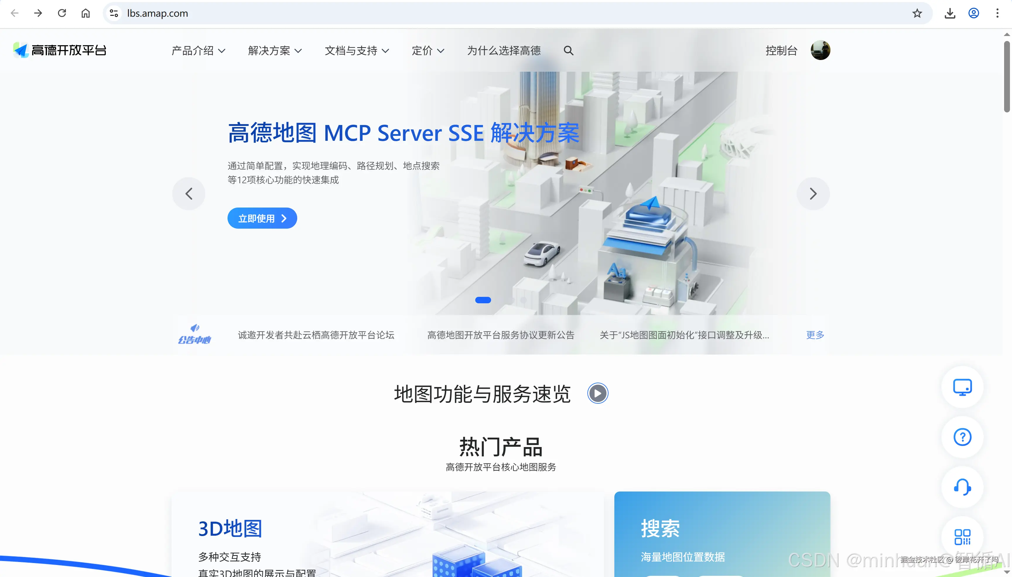 1.1 打开高德开放平台,注册后登录;
