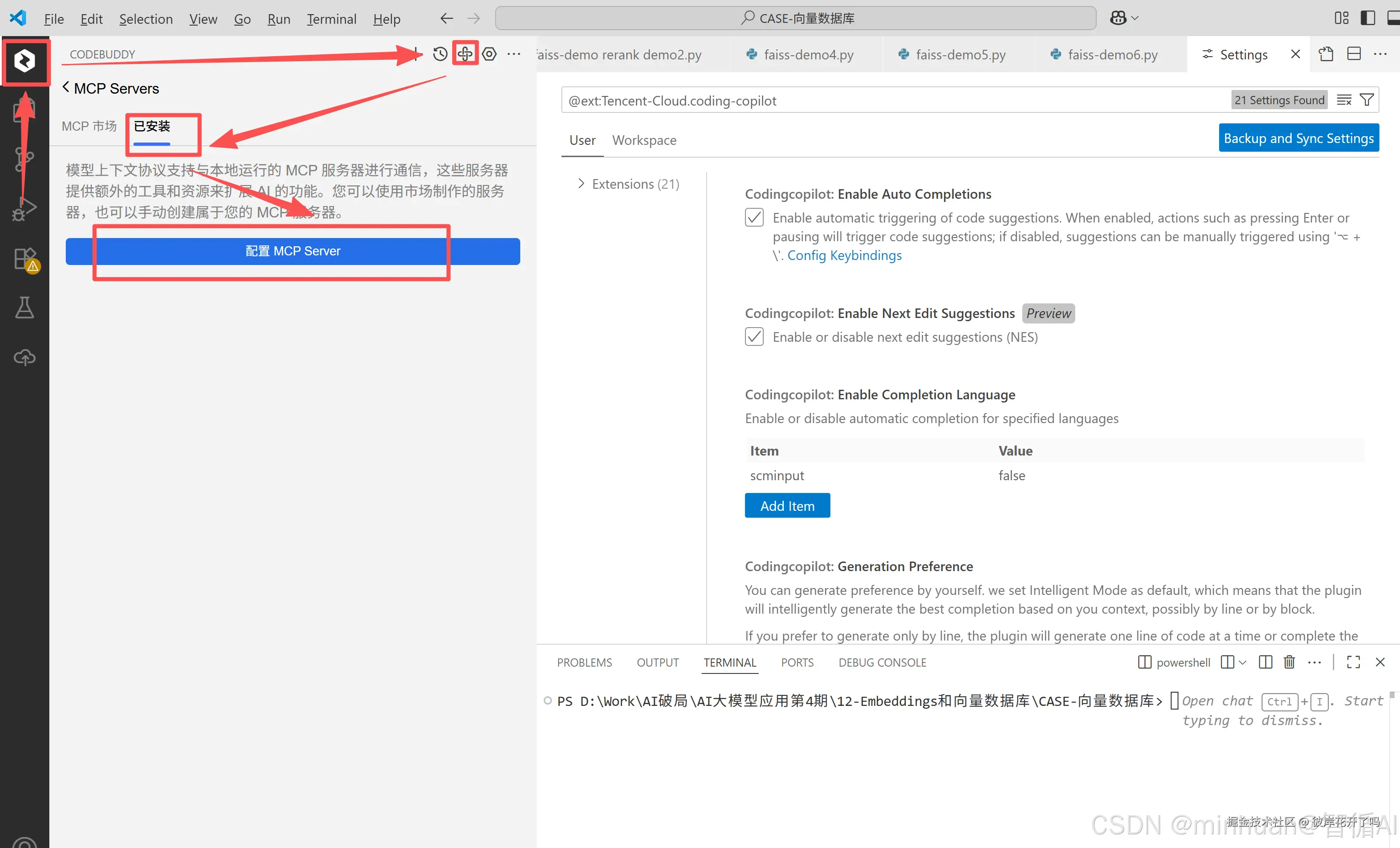 打开左侧Codebuddy插件图标,在点击顶部右侧导航栏的“MCP Marketplace”图标,选择已安装tab,点击“配置MCP Server”按钮;