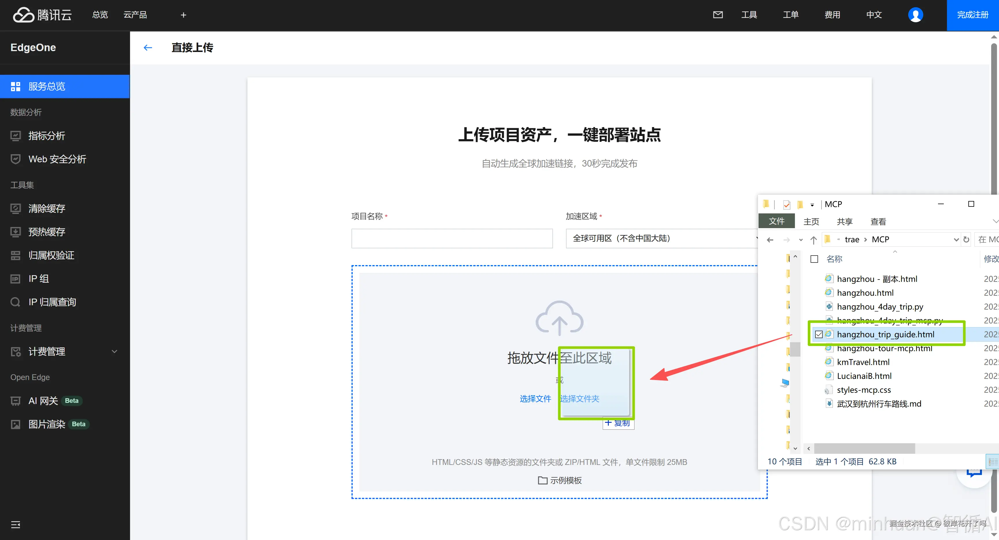 选中要上传的文件,直接拖入到上传的窗口;