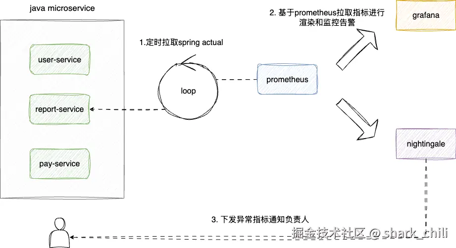 监控是可以确保提前暴露被即时发现解决,同时也可以作为日常循环后系统调优的佐证。所以量化一切监控体系之后,我们就需要搭建一个完善、安全、成熟的监控诊断体系来排查定位问题, 以笔者研发的java应用为例,主流的应用监控会通过micrometer采集目标监控指标,并将其同步到prometheus并通过grafana进行增强渲染,在此基础之上通过Nightingale针对这些告急的监控及时下发企微消息或者短信告警让研发人员介入解决问题: