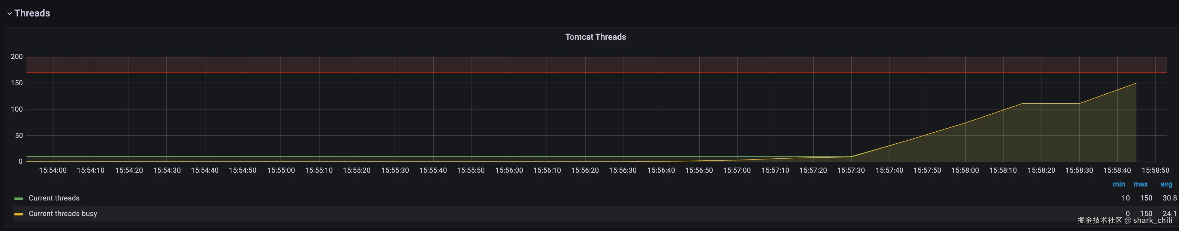 如下图,这就是笔者面板中最常见的容器线程直线飙升导致大量请求夯死超时,按照现有体系中的grafana监控面板,面对成百上千的接口请求,即时我们能够准确的做到故障发现,也无法非常快速精准的做到故障定位: