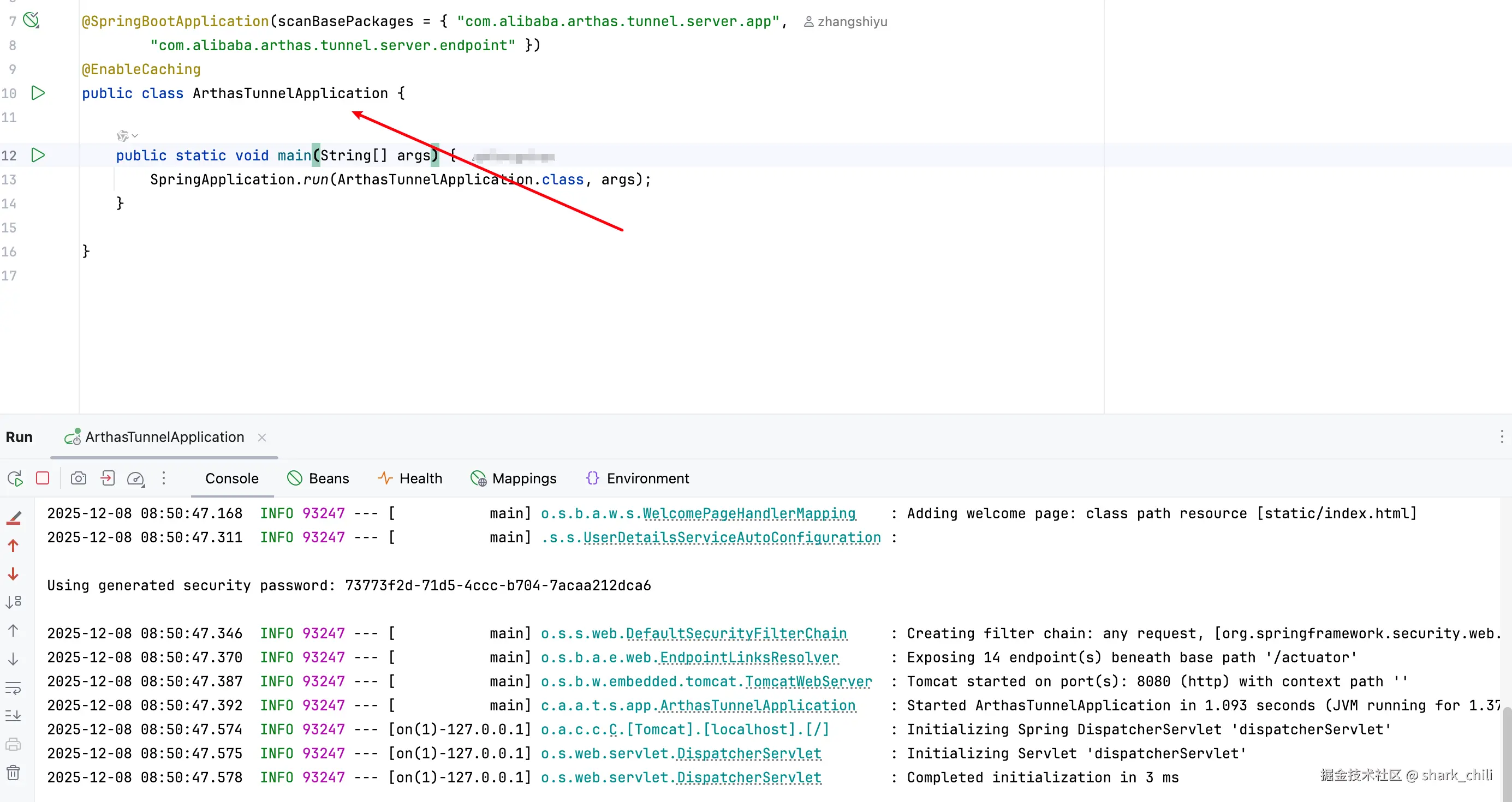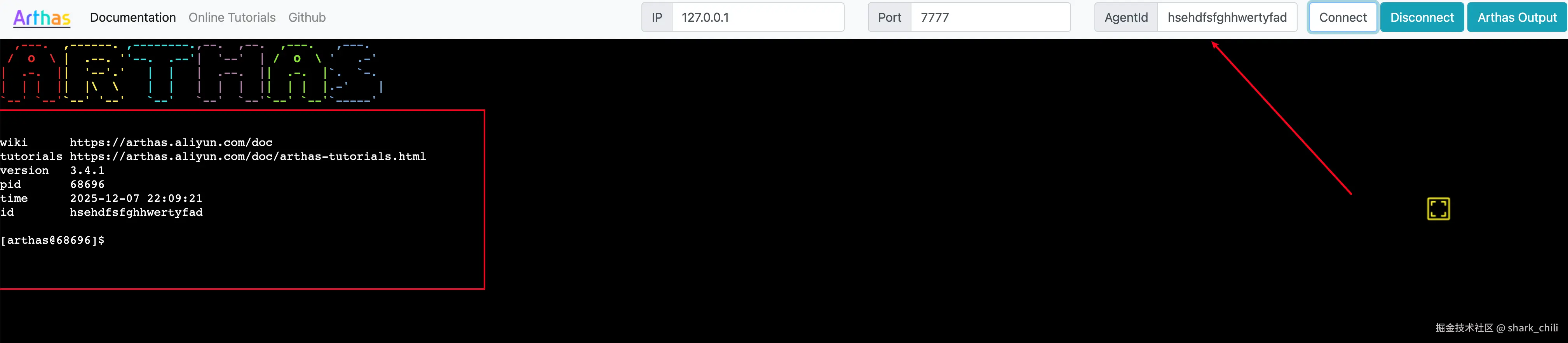 2025-12-07 22:09:21.370 INFO 68696 --- [ main] c.a.arthas.spring.ArthasConfiguration : Arthas agent start success.