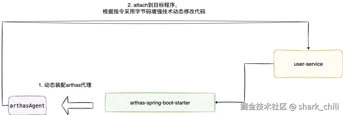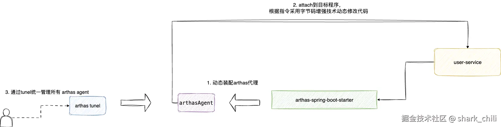 基于上述的说明,我们大体了解的监控诊断的一套理想架构,而本文将针对该架构进行演示和实践,按照arthas官网的说明,对于spring boot项目,我们在项目中引入arthas-spring-boot-starter,其底层会启动一个arthas进程并attach到装配的应用上,由此构建出当前服务的arthas agent: