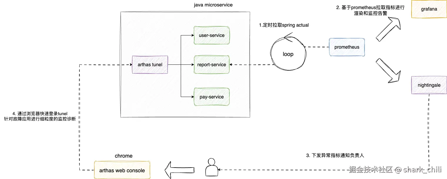 所以,在此基础之上笔者也给出了一套基于自己常见的工具所衍生了一套带有监控诊断的监控运维体系架构,即在上述监控体系下集成强阿里系中强大的监控诊断工具arthas。