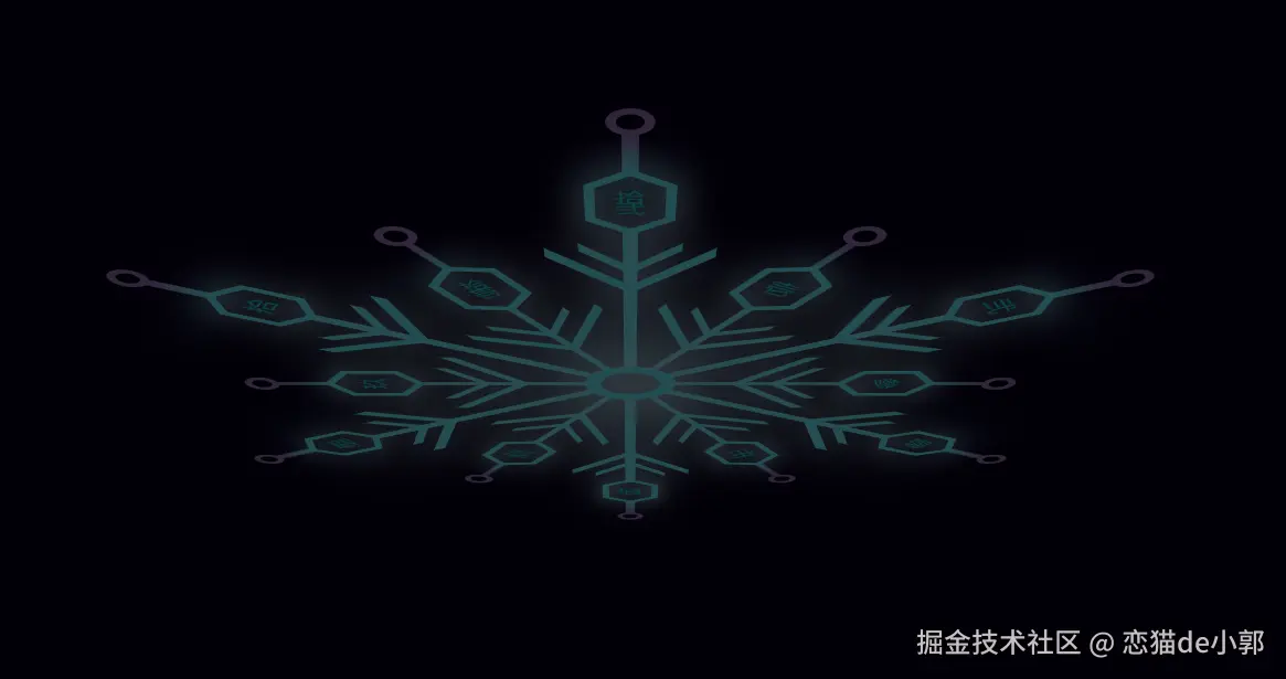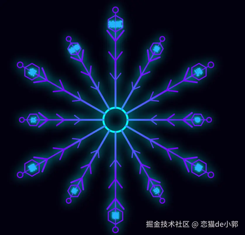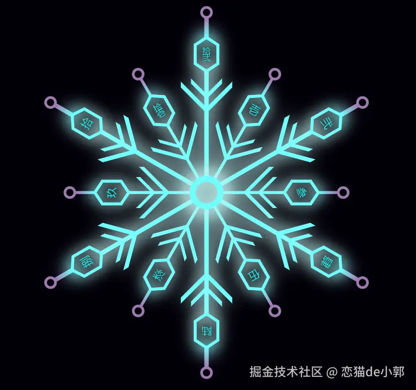循环 12 次绘制雪花瓣,代码通过 i % 2 == 0 判断当前是长轴还是短轴,从而实现错落有致的视觉效果(类似于雪花结构)
