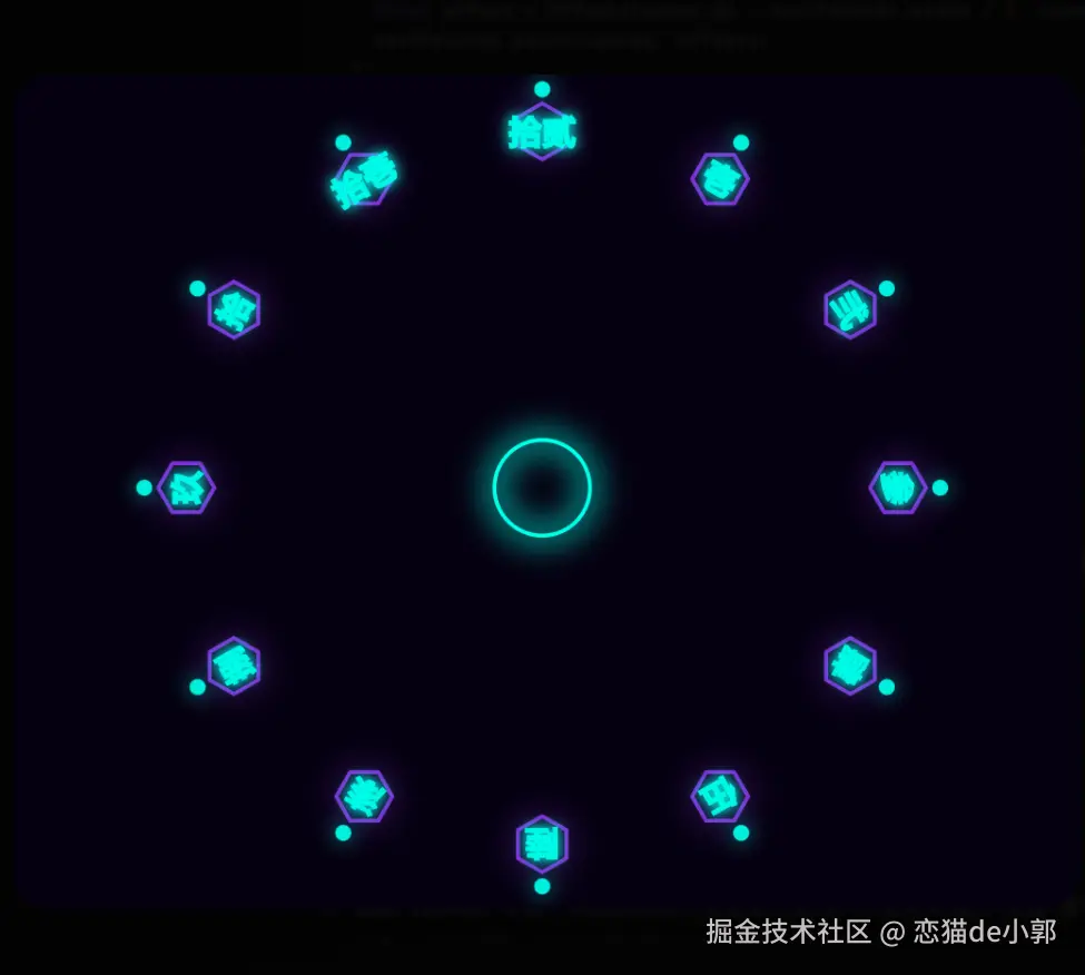 另外,文字也需要角度,当你画位于“3点钟”方向的文字“参”时,文字应该是正的,但当你画“6点钟”方向的文字时,如果直接画,文字可能会歪,所以代码在绘制六边形和文字时,用到了 canvas.rotate,这也是基于极坐标思想的延伸: