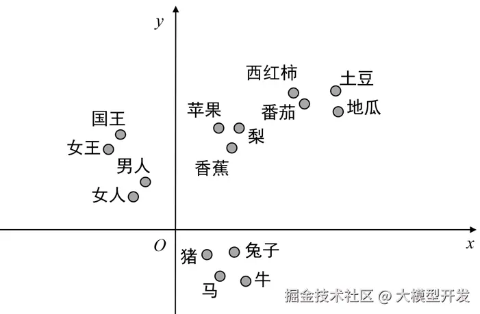那么,一个词嵌入向量,究竟代表了什么? 它代表了一个词在某个高维语义空间中的精确“坐标”。 让我们将这个高维空间简化为一个二维平面来理解。 假设一个词嵌入向量的长度为2,向量的第一个元素为x,第二个元素为y。在这个空间里,每一个词都是一个点。你会惊奇地发现: