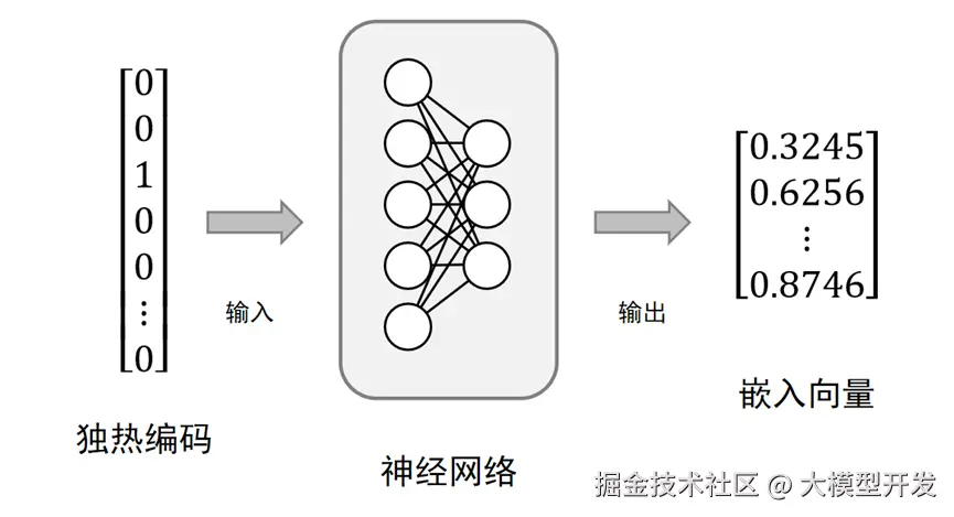 - 向量从只有一个1的“稀疏”状态,变为每个元素都是非零浮点数的“稠密”状态。