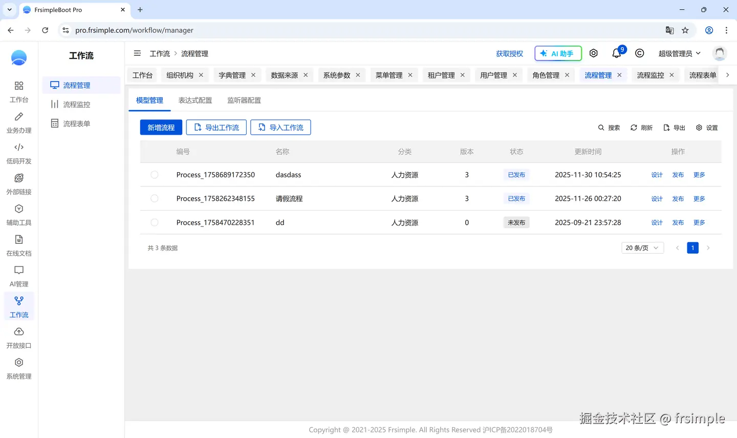 信创支持! frsimple数据化开发平台 frsimple 2025-12-08 33 阅读1分钟 基于springboot 2.8.18/3.5.8 ,jdk1.8和jdk17+双分支版本。 目前提供初始化脚本:达梦(oracle模式),oceanbase(msql模式),mysql 功能亮点:工作流引擎、对外开放接口、oauth2.0/2.1规范 体验地址 ⬇ tdesign版本:演示地址 element版本:演示地址