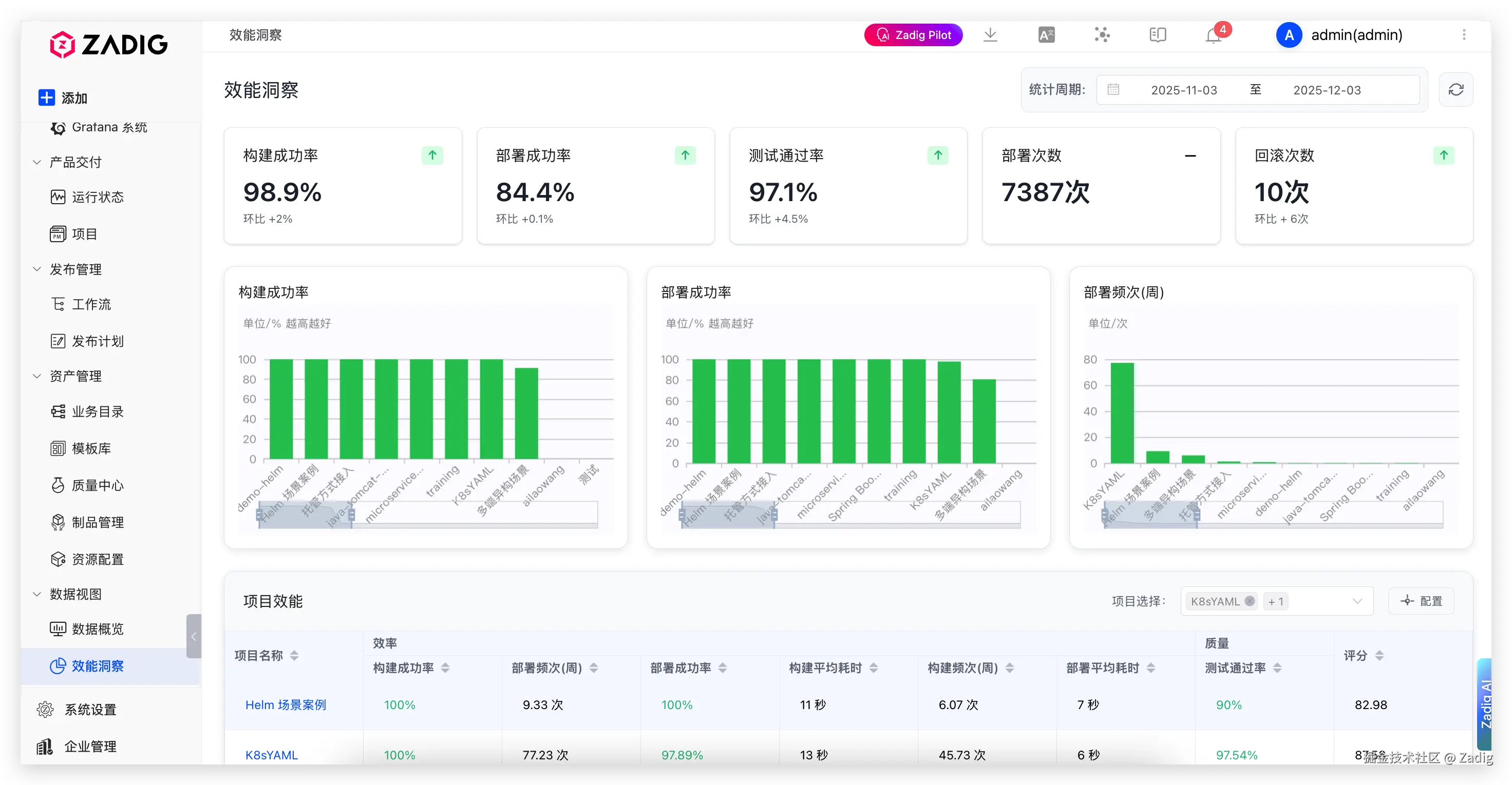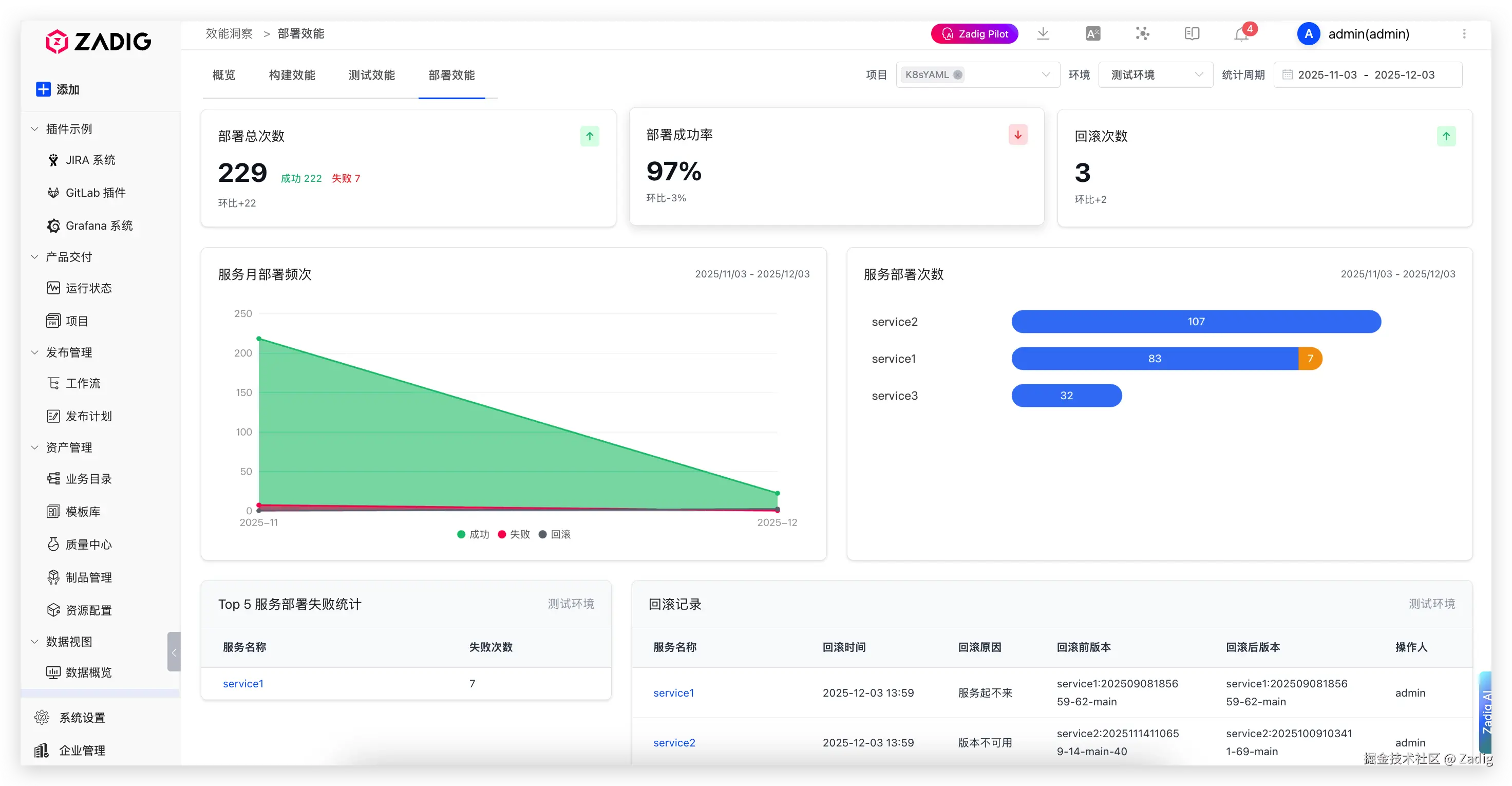 - 效能洞察全面升级:界面全面重构,显著提升数据可读性与用户体验;新增服务回滚数据统计,帮助团队精准定位稳定性问题;提供从构建到部署的全链路核心指标,决策更精准。