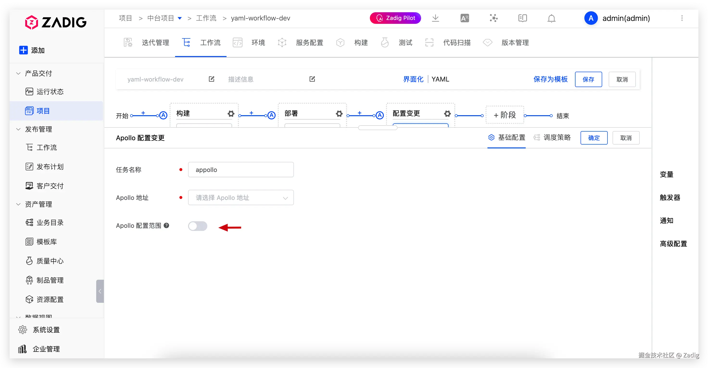 - 扩展能力增强:新增文件类型变量,支持直接上传配置文件、证书等;飞书审批可添加抄送人员;Nacos 配置变更支持 Group 过滤,Apollo 配置变更支持关闭范围控制;工作流通知新增代码扫描结果,质量状态一目了然。