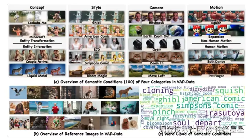 VAP-Data 是由字节跳动联合香港中文大学发布的目前规模最大的语义控制视频生成数据集,旨在为可控视频生成、可控动作合成、多模态视频模型等方向提供高质量训练与评测基准。该数据集包含超过 90,000 条精心整理的配对样本,覆盖 100 种细粒度语义条件,跨越概念、风格、动作和镜头四大语义类别,每类语义均包含多组相互对齐的视频实例。