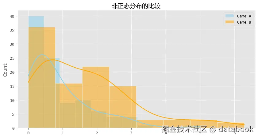 print(f"游戏A正态性检验P值: {p_norm_a:.4f} (小于0.05则非正态)")