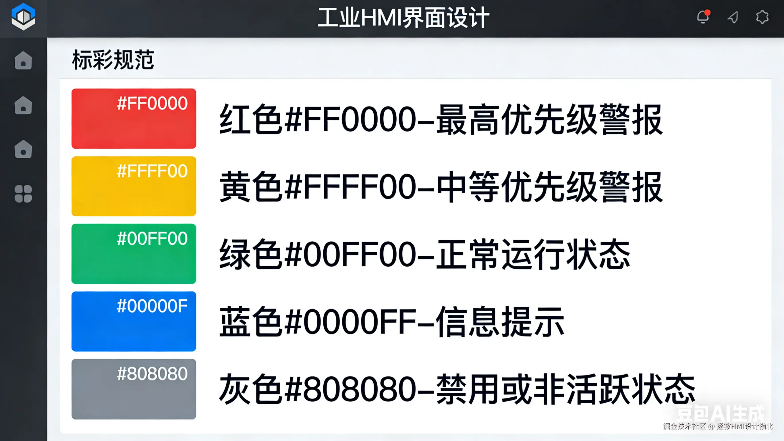 明确每种颜色的具体含义和使用场景(例如:“红色#FF0000仅用于最高优先级警报”)。