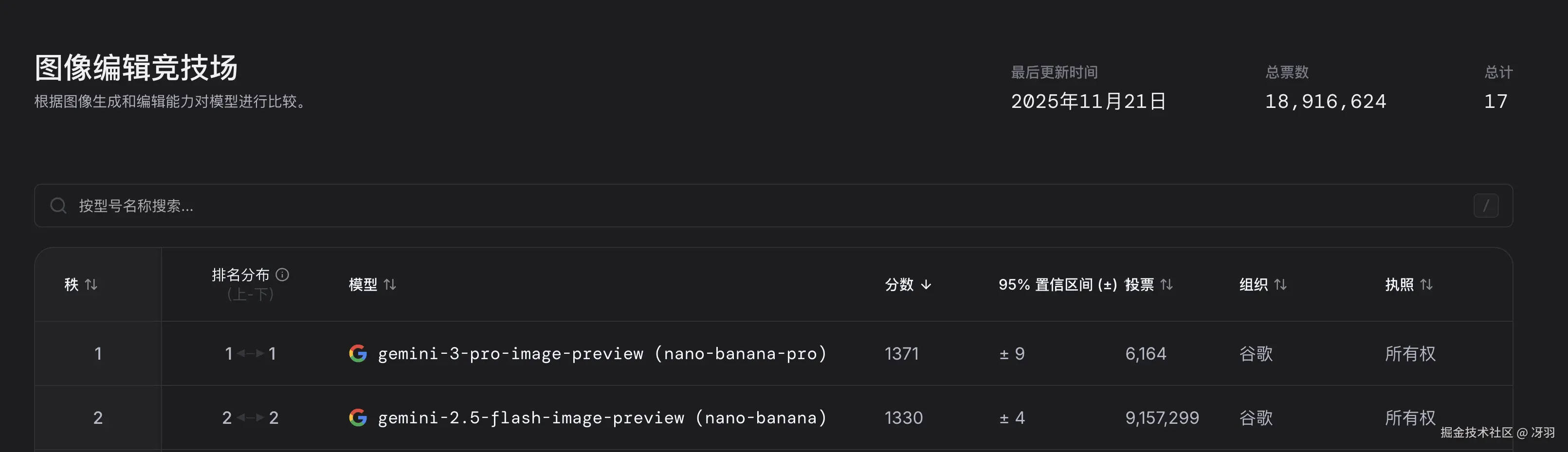 目前 Nano Banana Pro 在 LMArena 图片编辑模型排行榜中排名第一,而第二是 Nano Banana,可谓是断层领先了。
