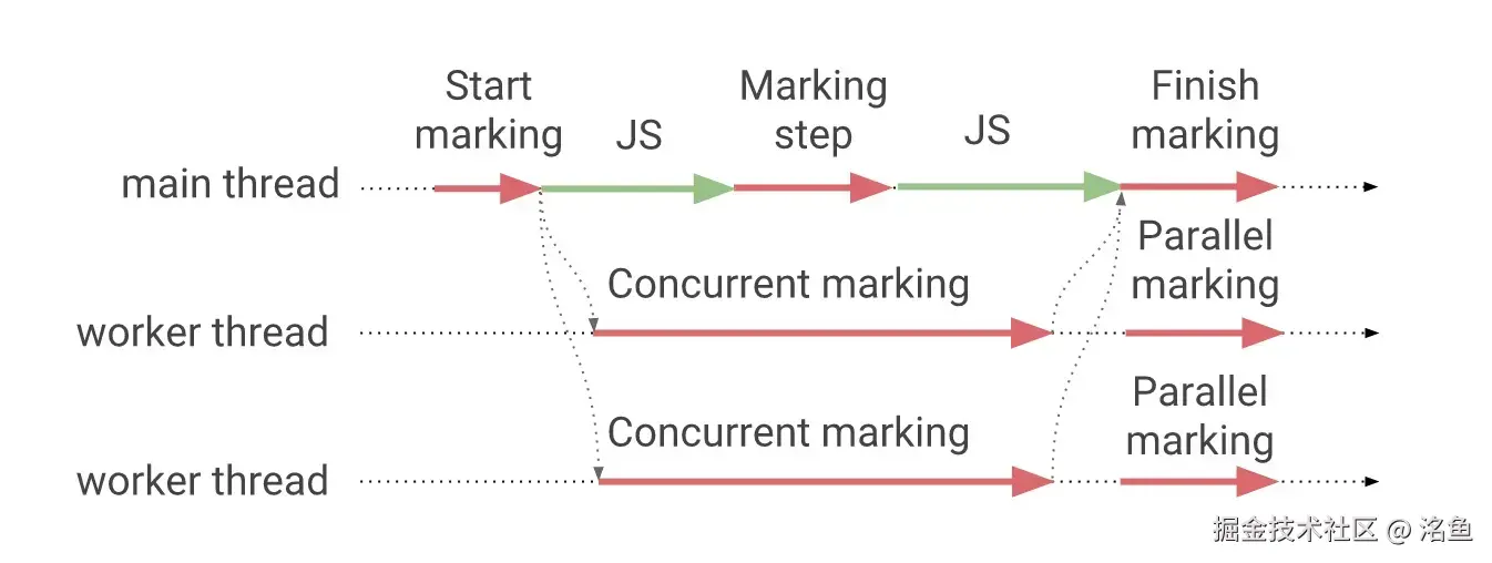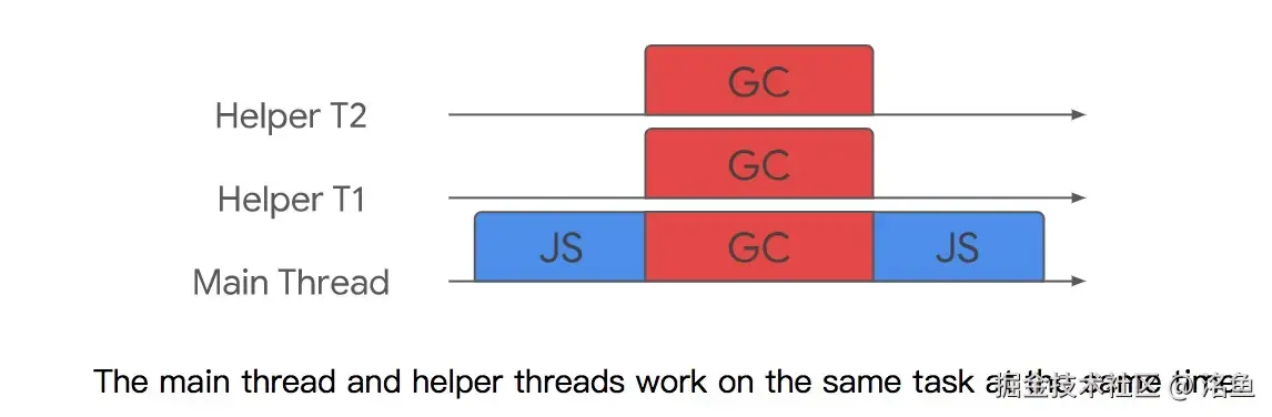 先说第一个优化 并行垃圾回收,我们之前提到过新生代内存区 和 老生代内存区根据之前讲过的垃圾回收机制,我们可以确定在新生代内存区中的对象和老生代内存区中的对象是完全不同的,那么也就是说新生代在执行 标记->复制->清理 的操作和老生代执行 标记->清理->紧凑 的操作是没有任何依赖关系的。