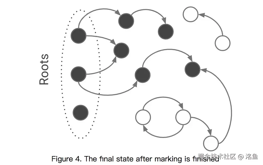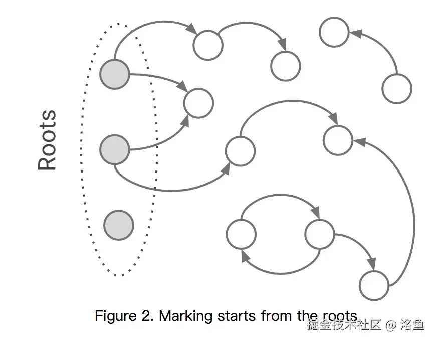 首先是标记过程阶段。标记阶段就是从一组根元素开始,递归遍历这组根元素,在这个遍历过程中,能到达的元素称为活动对象,没有到达的元素就可以判断为垃圾数据。