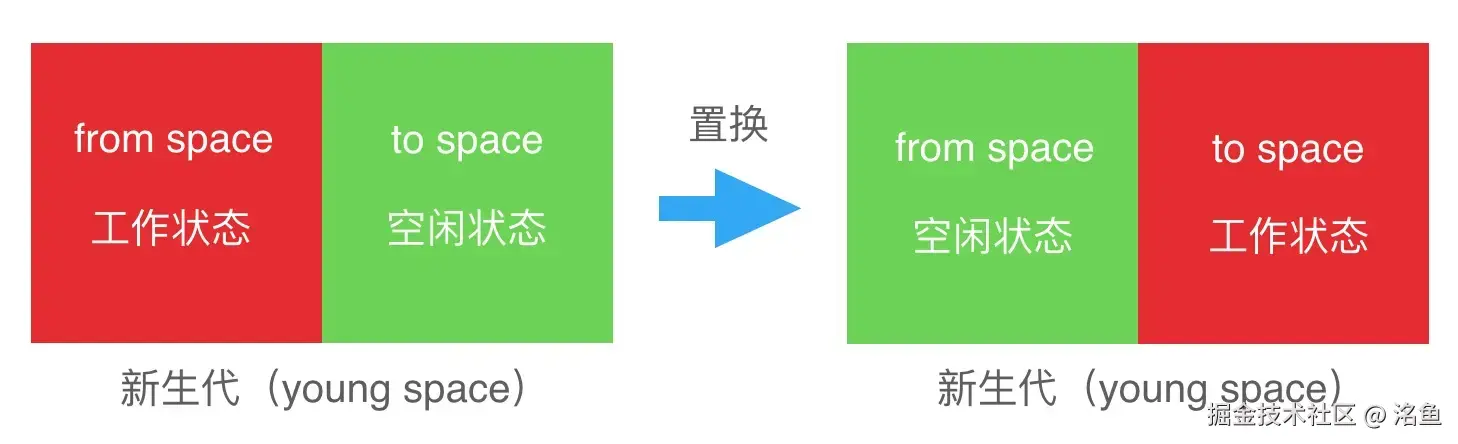 新生代内存区会分成两个部分(space),from space 和 to space , 这两个区域本质都是一样的,都拥有两个状态 工作状态 和 空闲状态且当一个为工作状态的时候另一个一定是空闲状态。