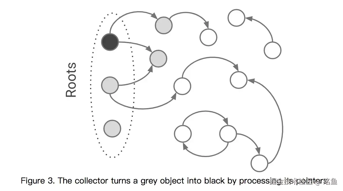 - 当垃圾回收程序发现一个对象被引用会将这个对象标记为 灰色 并将其推入到 标记工作表 中。