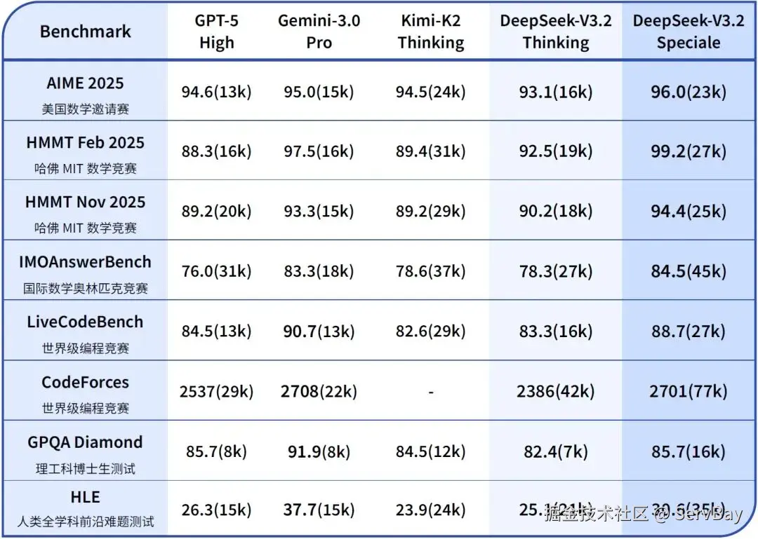 - 业内一直说“开源模型永远落后闭源模型8个月。”这个结论不好说对不对,但 v3.2 标准版对标 GPT-5,Speciale 版在竞赛中横扫金牌,证明了开源模型在顶级智力任务上已经具备了与闭源巨头(OpenAI, Google)正面硬刚的实力。