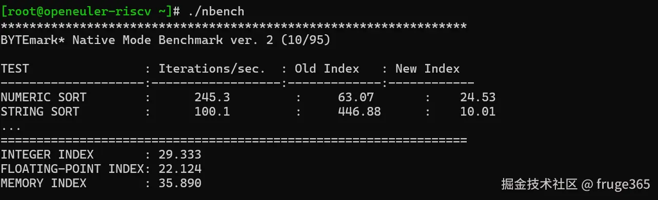 接下来,我使用 nbench——一个经典的 Linux 系统综合性能工具,来观察系统在 CPU 计算能力和内存处理效率上的表现。通过实际运行各项基准任务,可以直观感受 openEuler 在 RISC-V 架构下的多核算力和内存管理能力。