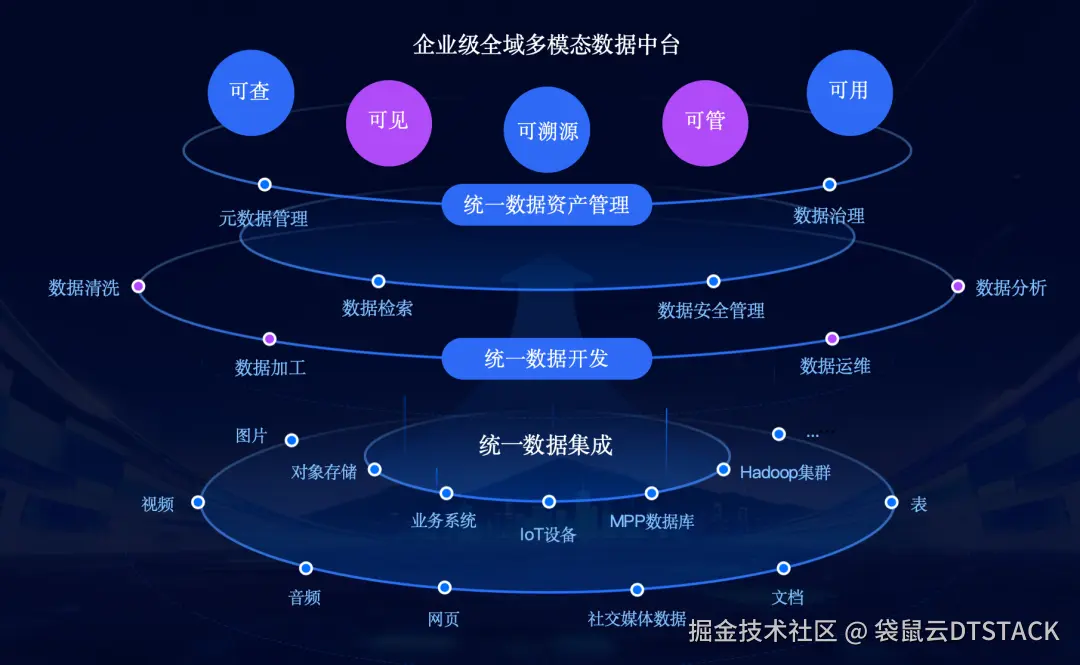(1)多模态融合治理: 不仅能接入和存储多源数据,更要能在统一的平台内,对结构化、半结构化(JSON、日志)和非结构化(音视频、文档)数据进行统一的清洗、加工、转换和元数据建模。