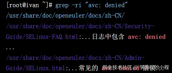 grep -ri "avc: denied" /usr/share/doc/openeuler/docs/zh-CN/ - 发现文档: 终端输出