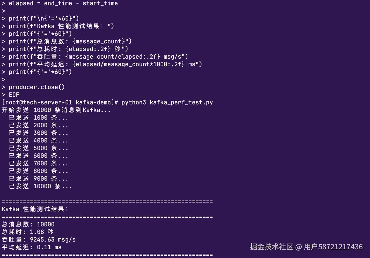 对比参考:之前测试RabbitMQ是10528 msg/s,Kafka是9245 msg/s。考虑到Kafka要写磁盘做持久化,而RabbitMQ跑的是内存模式,这个差距很正常。如果都做持久化,Kafka的优势会更明显。