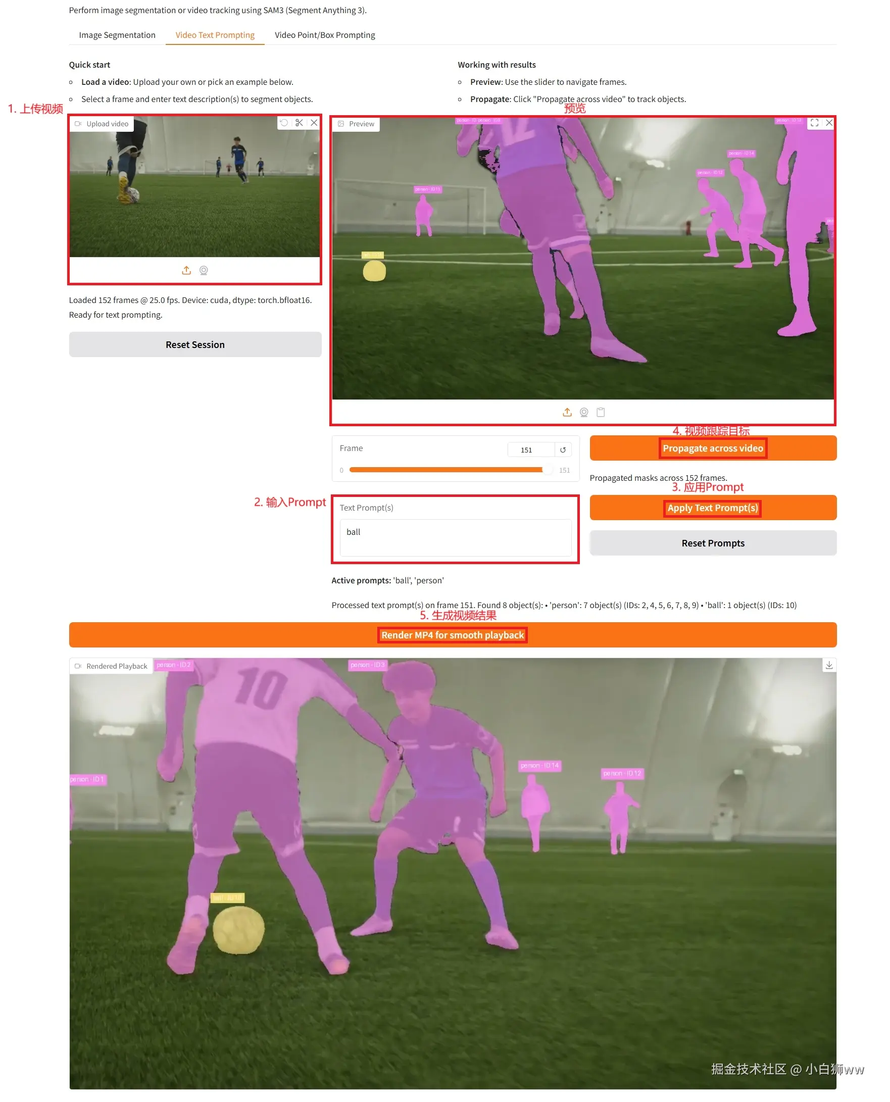 本教程提供 Image Segmentation 、Video Text Prompting、Video Point/Box Prompting 三个示例供测试。模型仅支持英文输入。