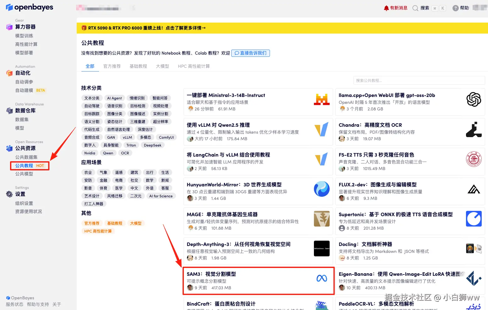 首先点击「公共教程」,找到「SAM3:视觉分割模型」,单击打开。