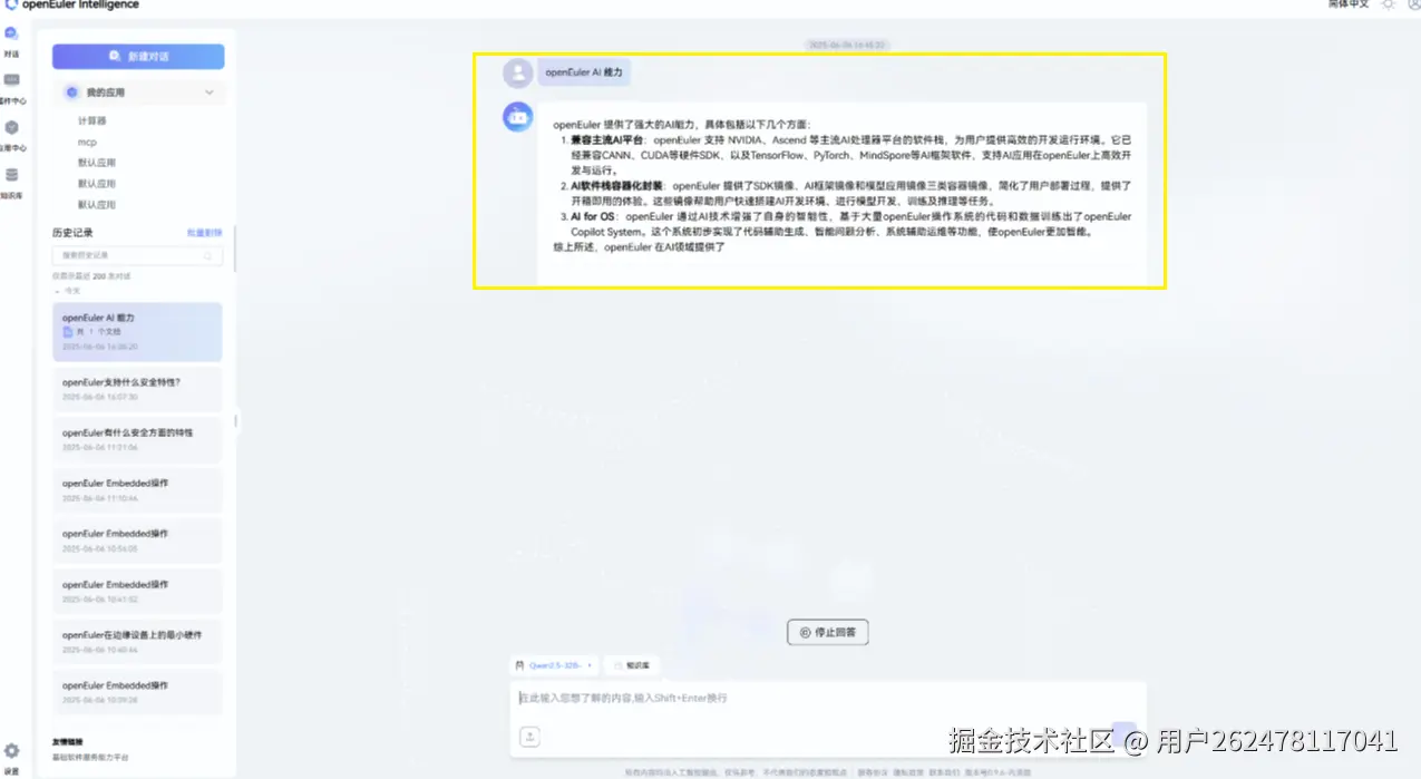 通过以上完整部署流程,我们成功在华为云 openEuler 22.03 LTS 系统上部署了 openEuler Intelligence 智能化平台。该平台提供了强大的知识管理和智能问答能力,特别适合企业级知识库建设和智能化客服场景。平台的主要优势包括: