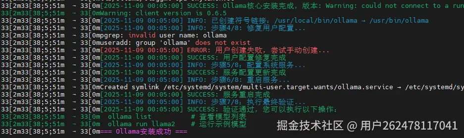 该步骤记录了Ollama人工智能模型平台(版本0.6.5)在部署过程中成功完成系统集成的关键步骤。尽管在创建专用用户和用户组时遇到了"invalid user name: ollama"和"group 'ollama' does not exist"的配置错误,但部署脚本通过自动检测并执行手动创建成功修复了用户配置。整个过程系统完成了核心文件安装、创建符号链接、更新系统服务配置并重启服务,最终通过全部验证。