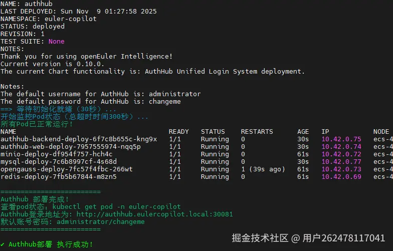 在 euler-copilot 命名空间成功部署了 AuthHub 统一登录系统(Chart 版本 0.10.0),包含完整的认证服务栈:
