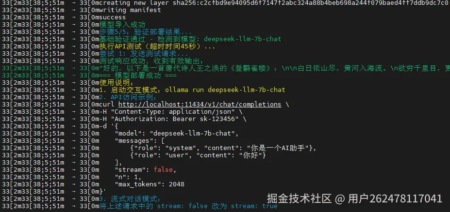 DeepSeek-LLM-7B-Chat 模型的部署成功日志,显示了模型已成功导入并通过验证测试。系统提供了三种使用方式: