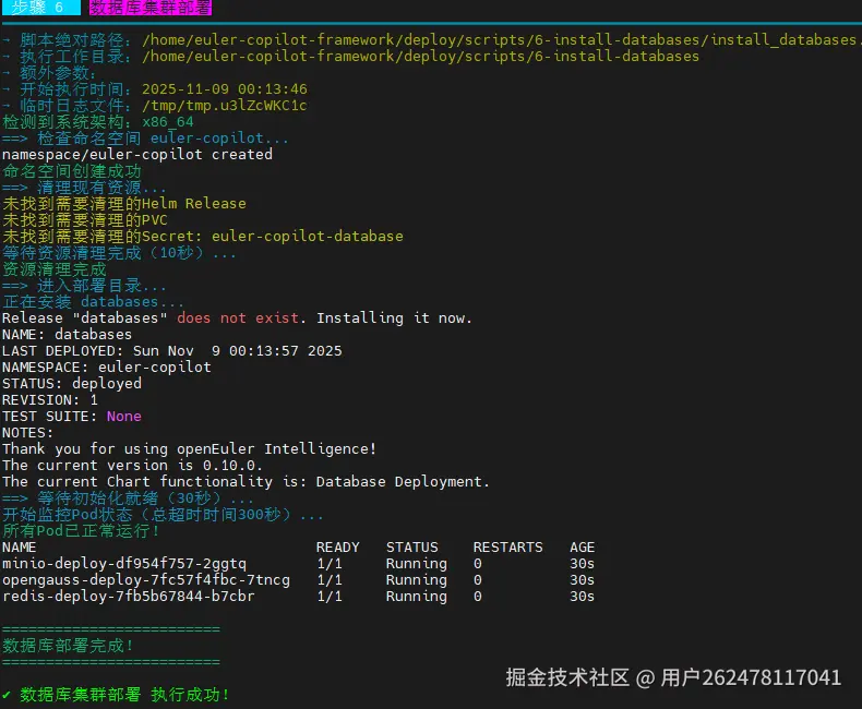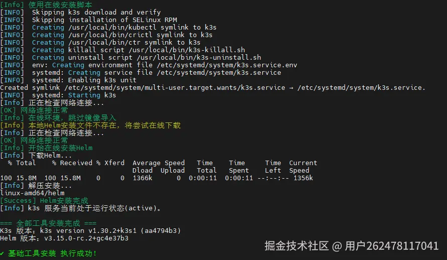 部署脚本通过在线方式,自动完成了容器编排工具K3s(v1.30.2)和软件包管理工具Helm(v3.15.0)的下载与安装,并确认了K3s服务已成功启动并运行。整个过程顺利无误,标志着部署所需的核心底层基础设施已准备就绪,为后续部署更上层的应用服务(如数据库、大模型等)奠定了可靠的基础。